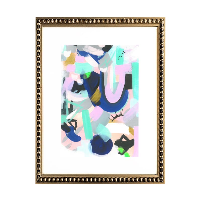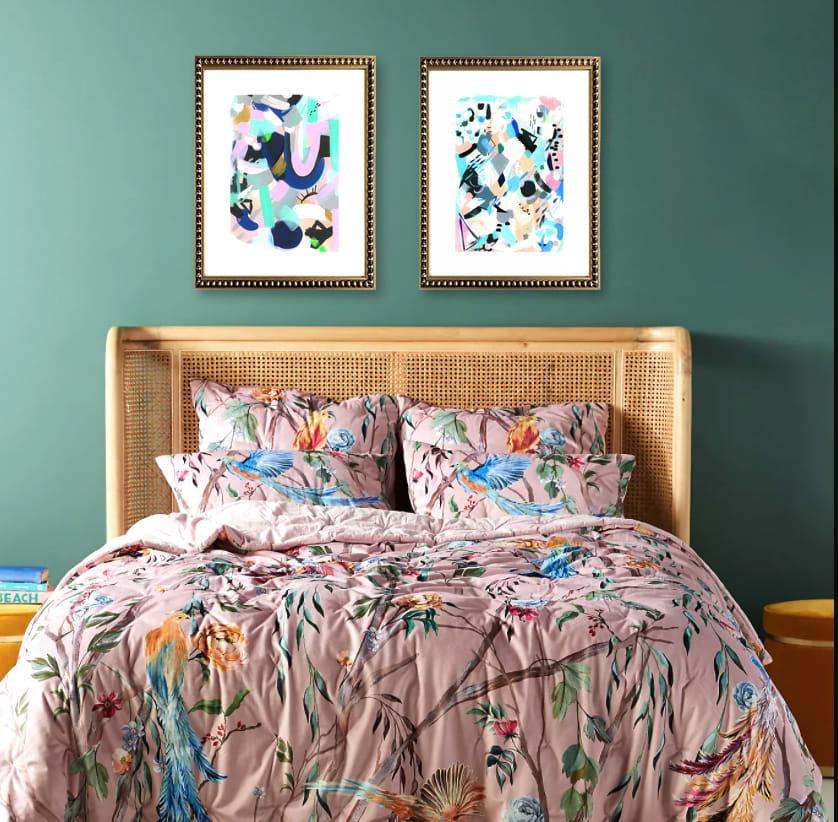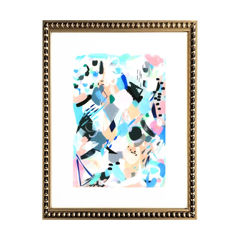 Pack de dos cuadros con diseños abstractos en color, paspartú blanco y Marco de madera con perlas dorado.