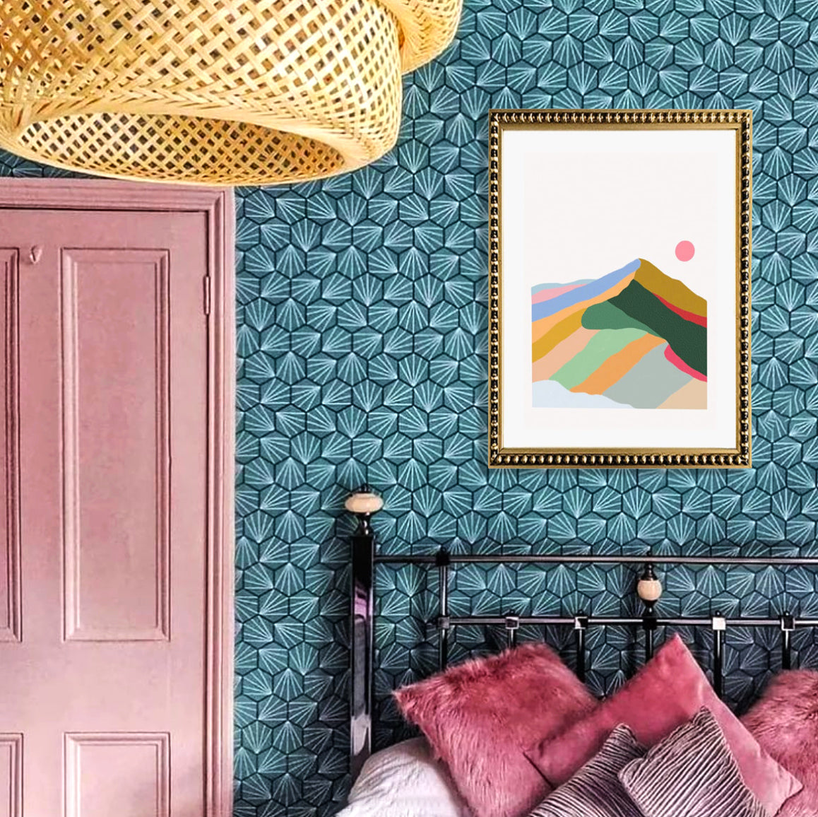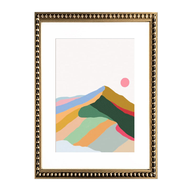Cuadro de ilustración digital de cerros en color, paspartú blanco y marco de madera color dorado con perlas.