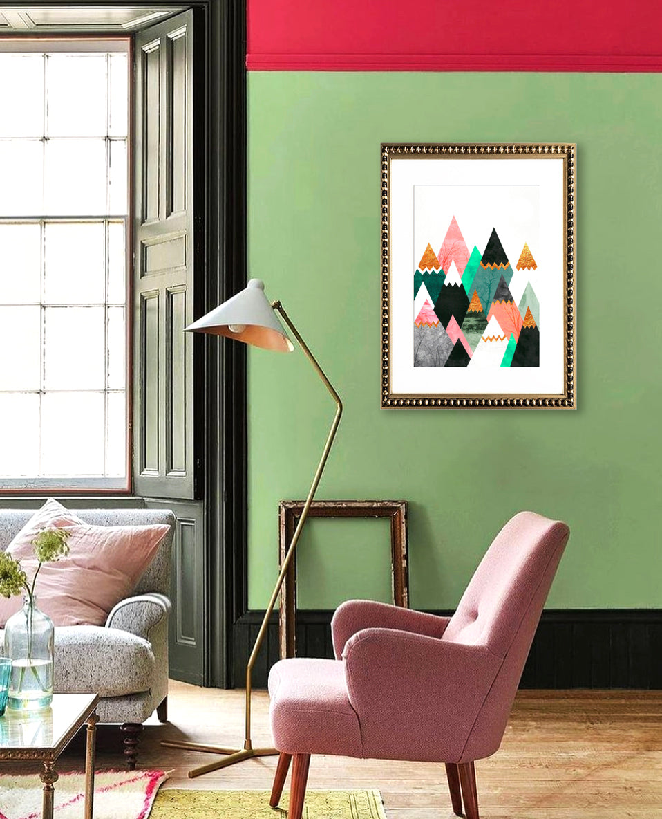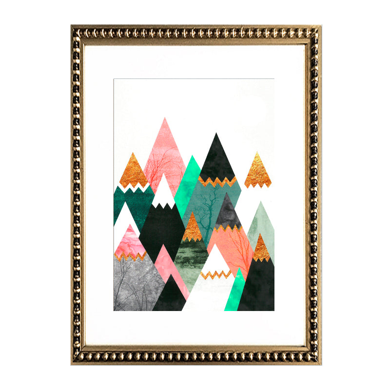 Cuadro reproducción de cerros en colores con paspartú blanco y marco perla dorado delgado.