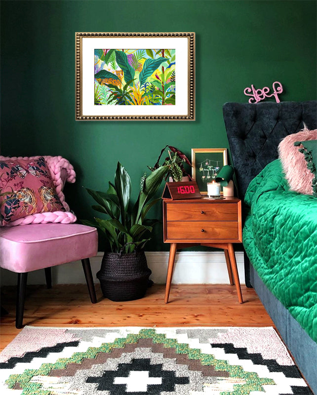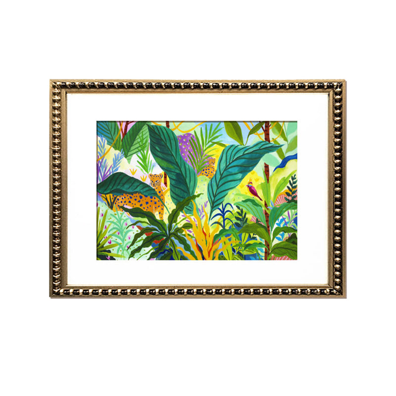 Cuadro de pareja de chita en selva verde, con paspartú blanco y marco de madera con perlas color dorado.