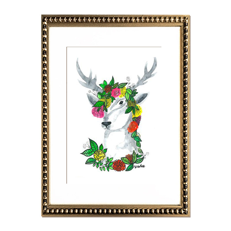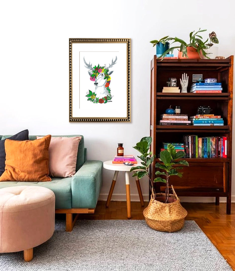 Cuadro reproducción de ciervo con flores en acuarela, paspartú blanco y marco perla dorado delgado.