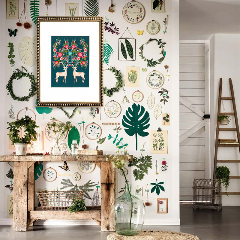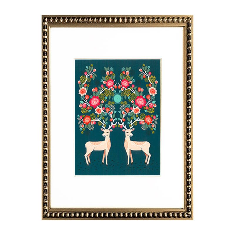 Cuadro reproducción de ciervos en flores, paspartú blanco y marco perlas dorado delgado.