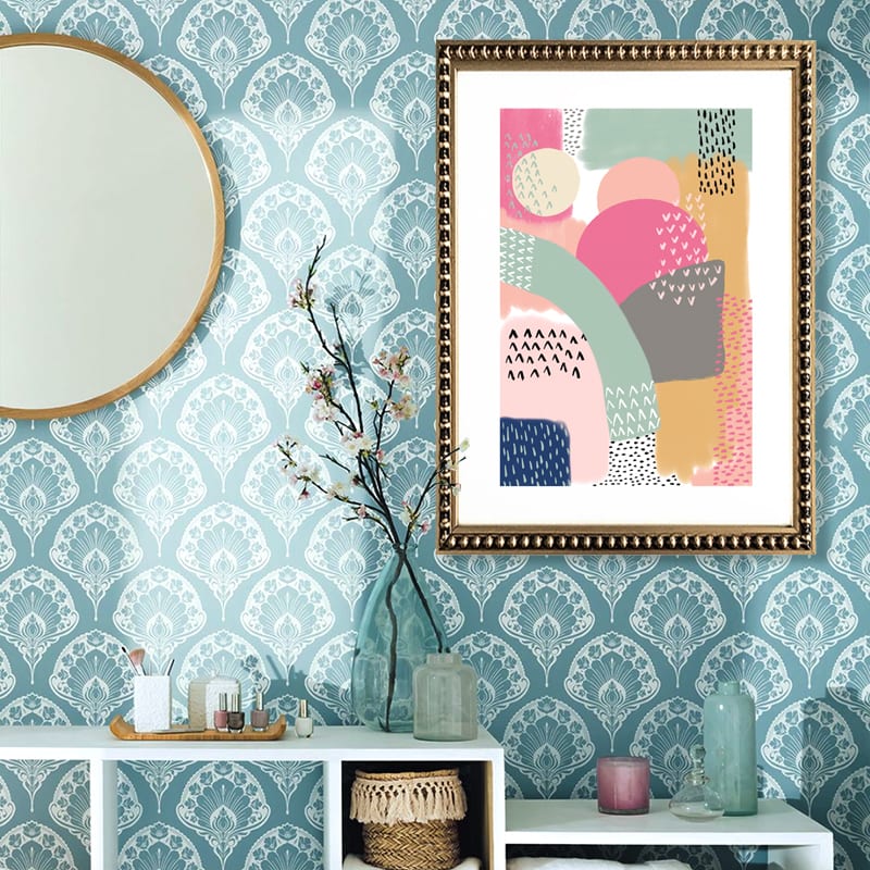 Cuadro de diseño abstracto de colores con paspartú blanco y marco dorado con perlas.
