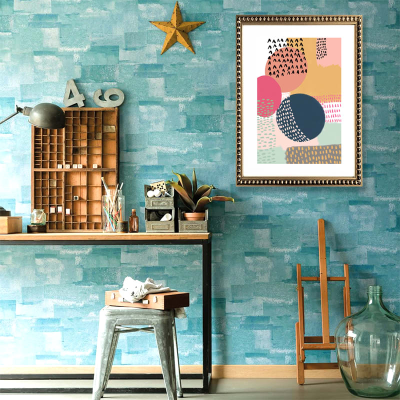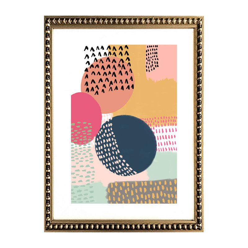 Cuadro de diseño abstracto de colores con paspartú blanco y marco dorado con perlas.