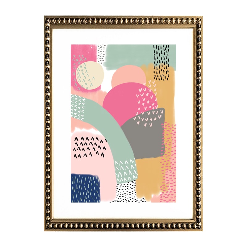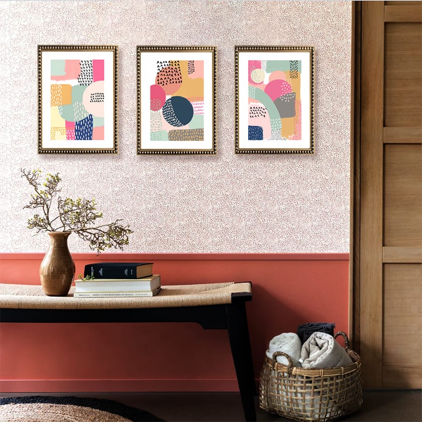 Pack de 3 cuadros de diseño abstracto de colores con paspartú blanco y marco dorado con perlas.