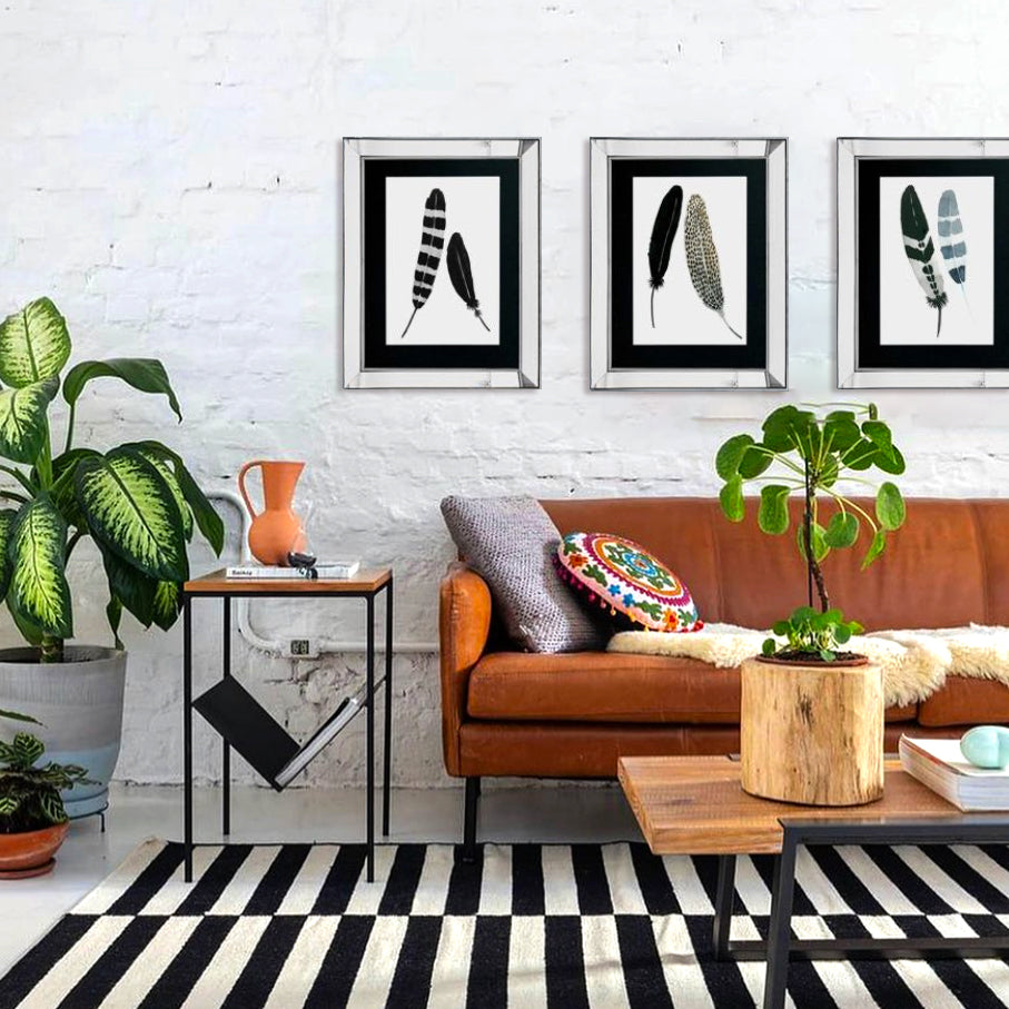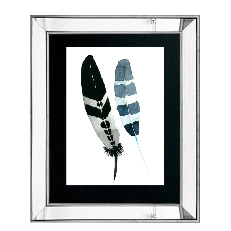 Pack de 3 cuadros de plumas reproducción de acuarela, con paspartú color negro y marco espejo con borde plata.