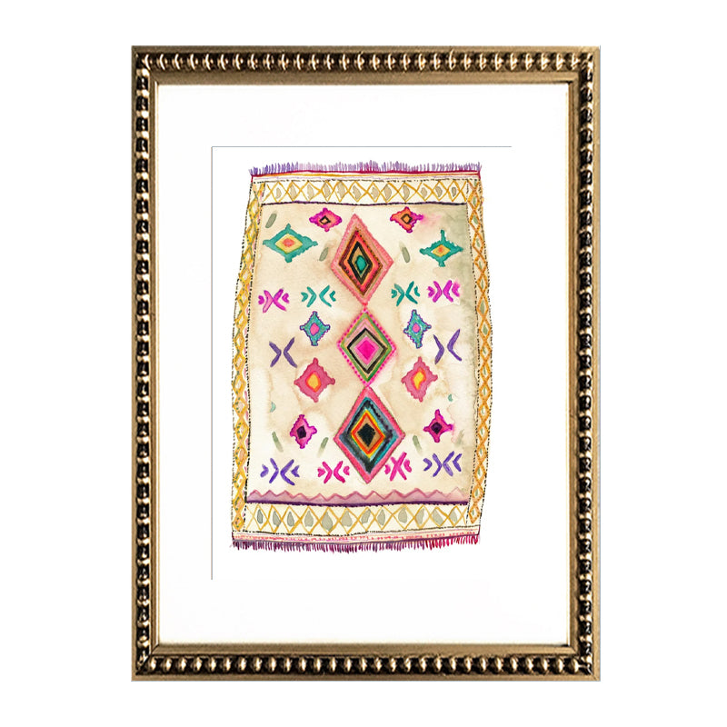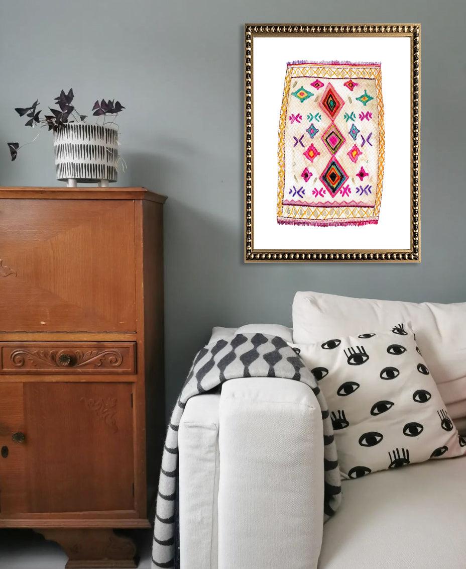 Cuadro reproducción de pintura en acuarela de diseño marroquí con marco de perlas dorado.