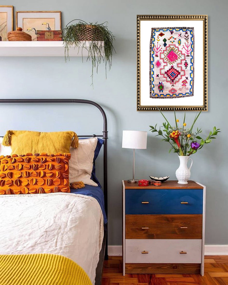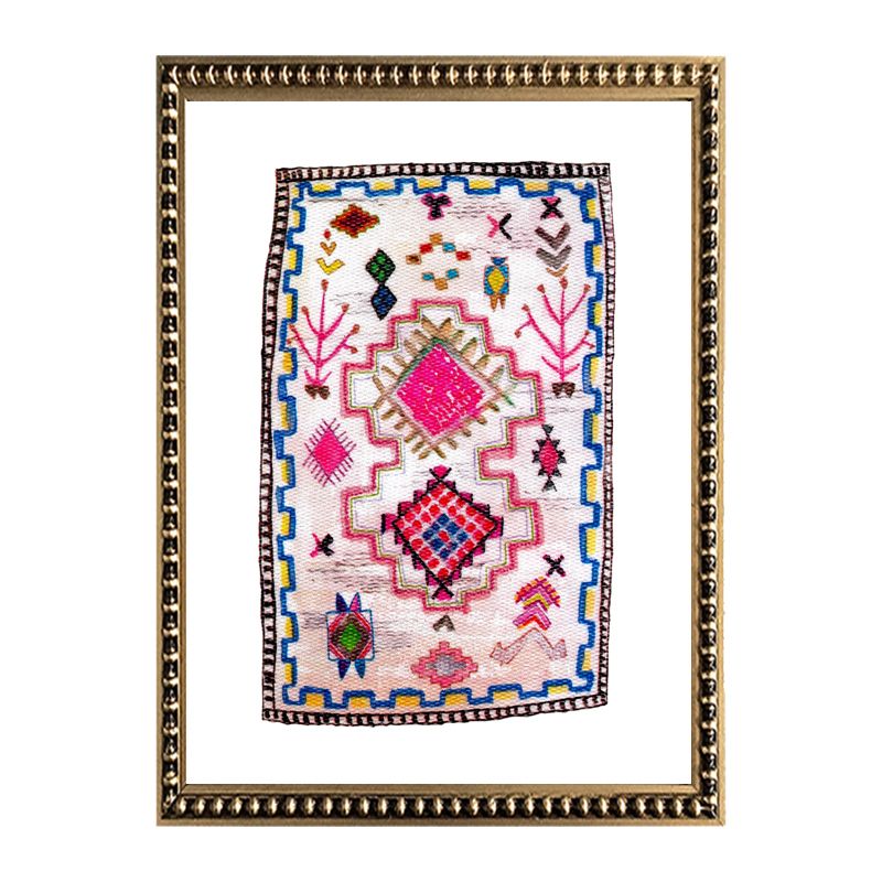 Cuadro reproducción de pintura en acuarela de diseño marroquí con marco de perlas dorado.