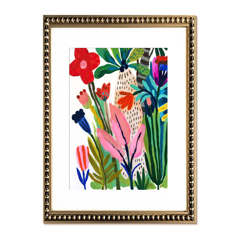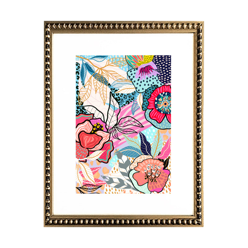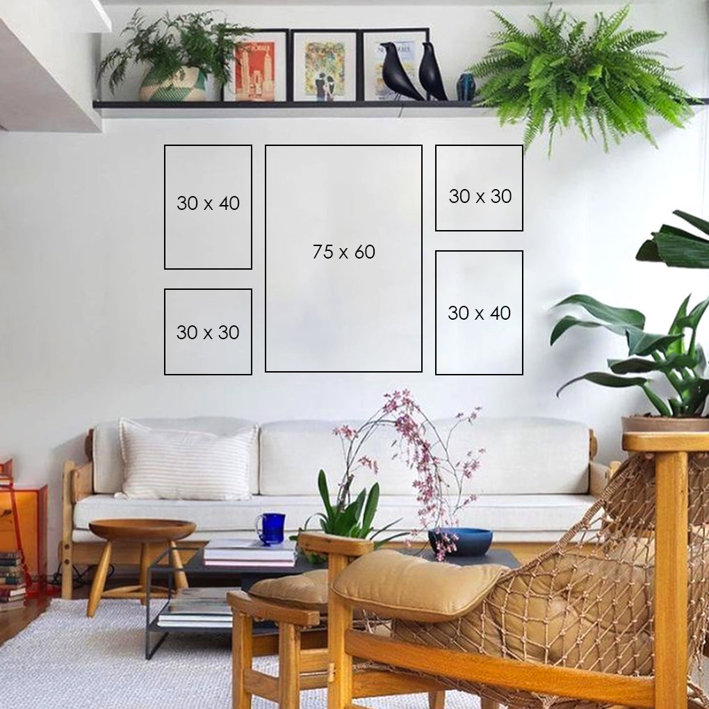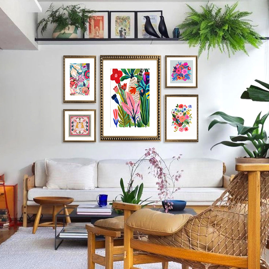 Pack de 5 cuadros en composición, diseños varios, paspartú blanco y negro, marco perla dorado, plata y pirámide dorado.