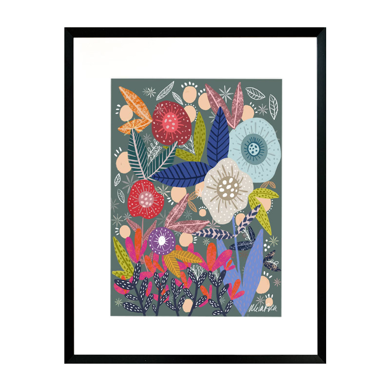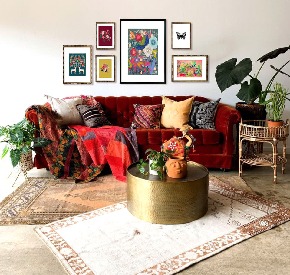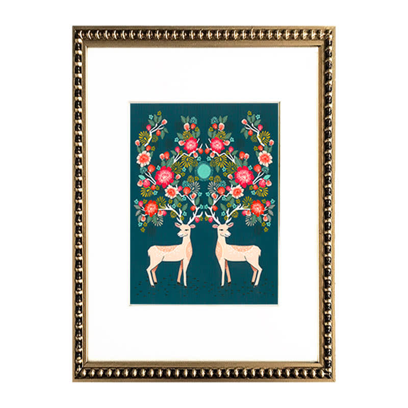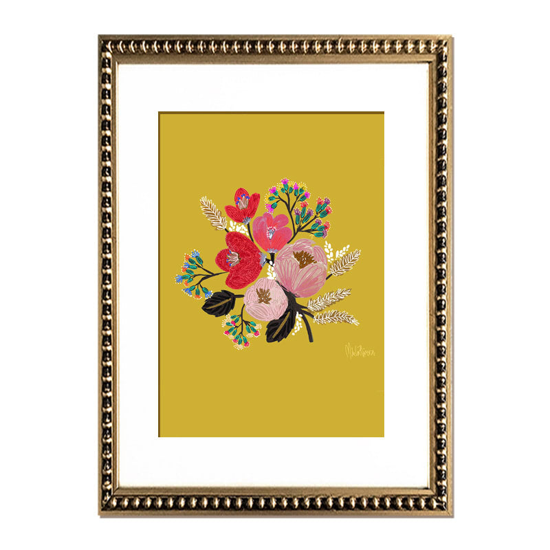 Composición de 6 cuadros de varios tamaños, paspartú blanco y marcos de madera negro y de perlas dorado.