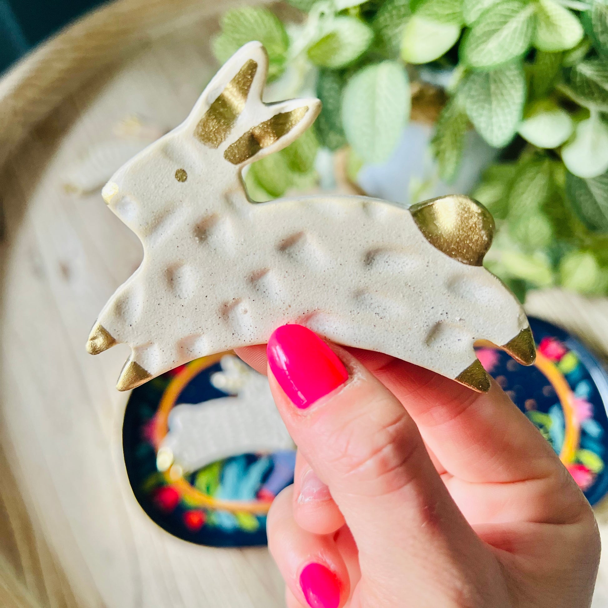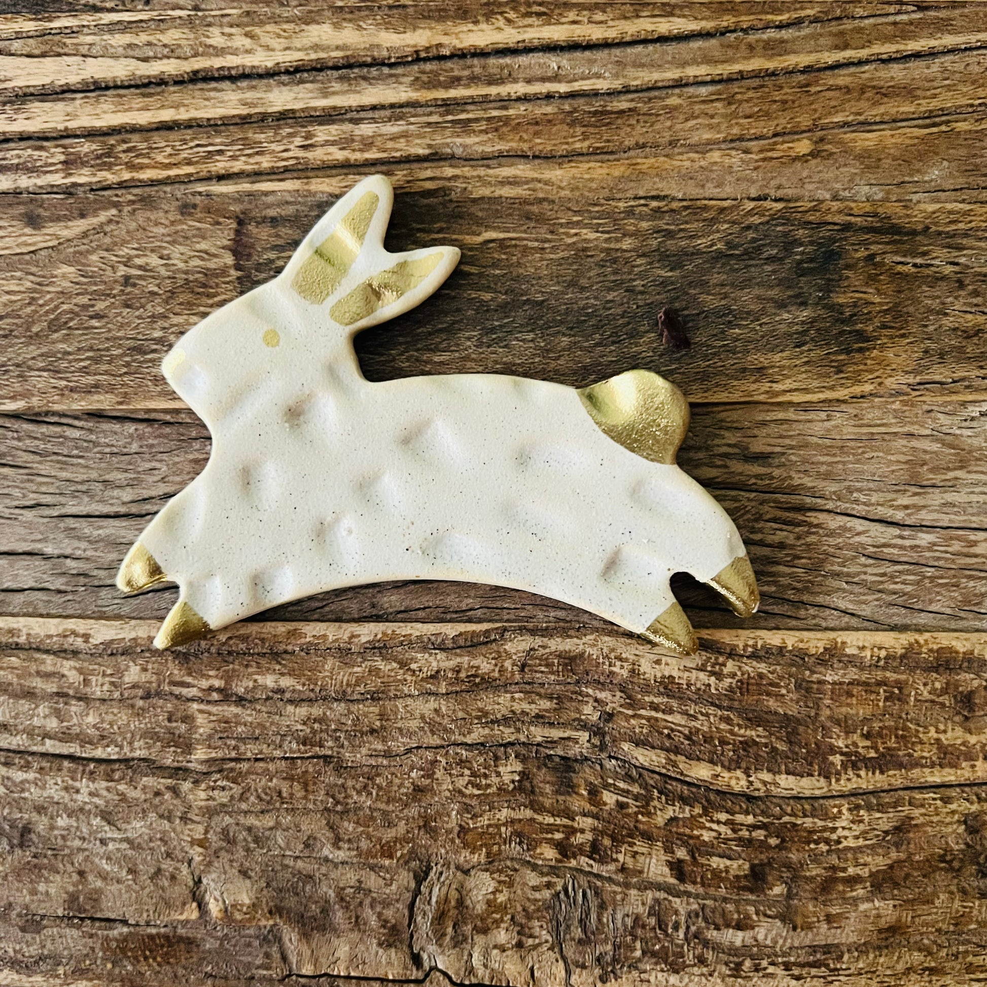 Conejito hecho en cerámica gres, esmaltado en color blanco con detalles en dorado con textura.