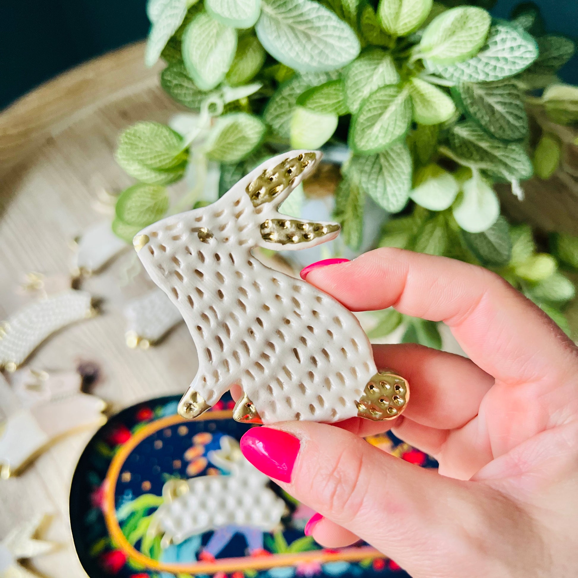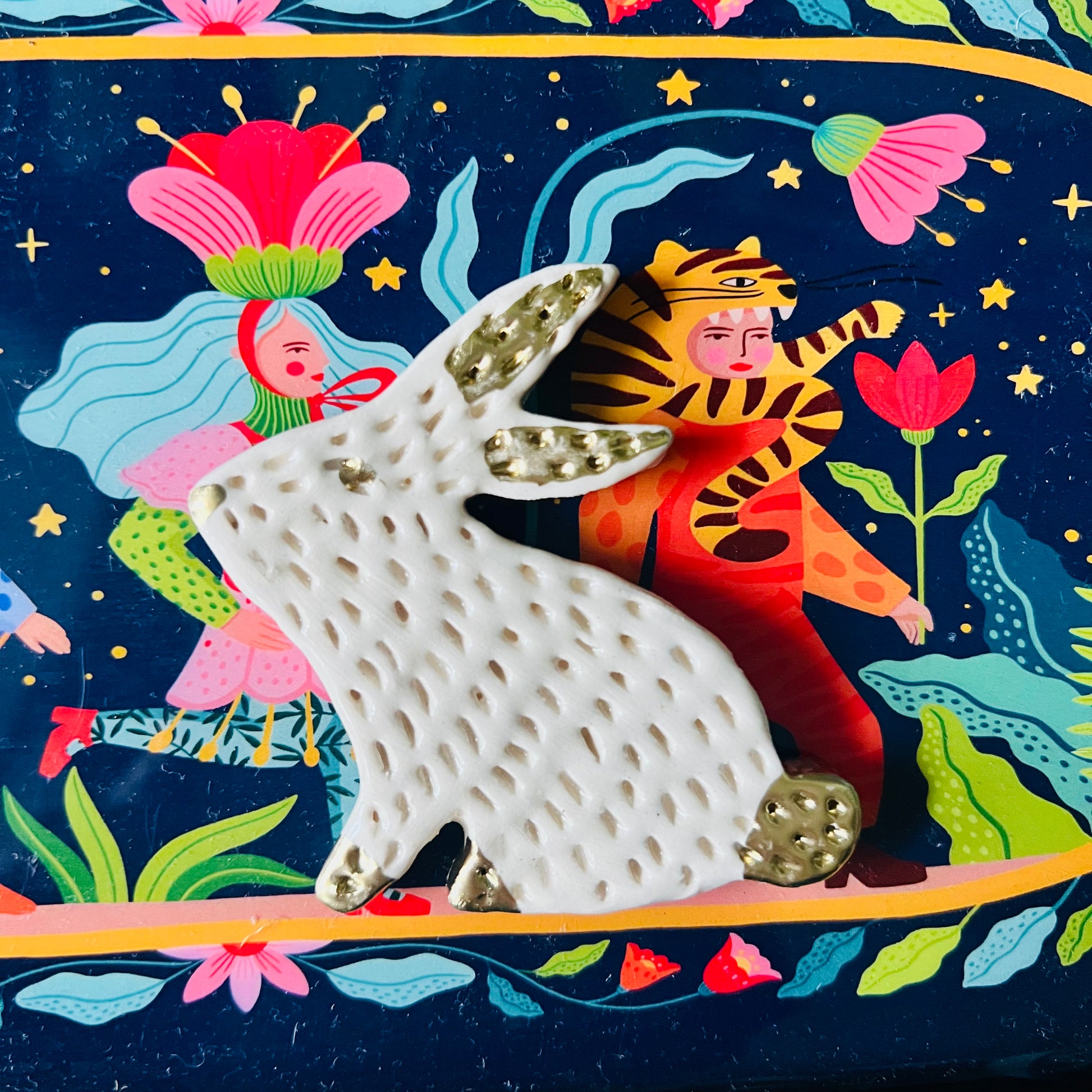 Conejito hecho en cerámica gres, esmaltado en color blanco con detalles en dorado con textura.