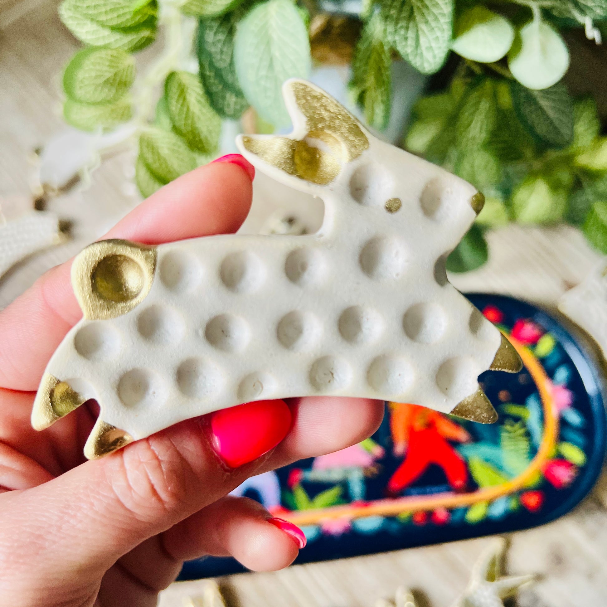 Conejito hecho en cerámica gres, esmaltado en color blanco con detalles en dorado con textura.