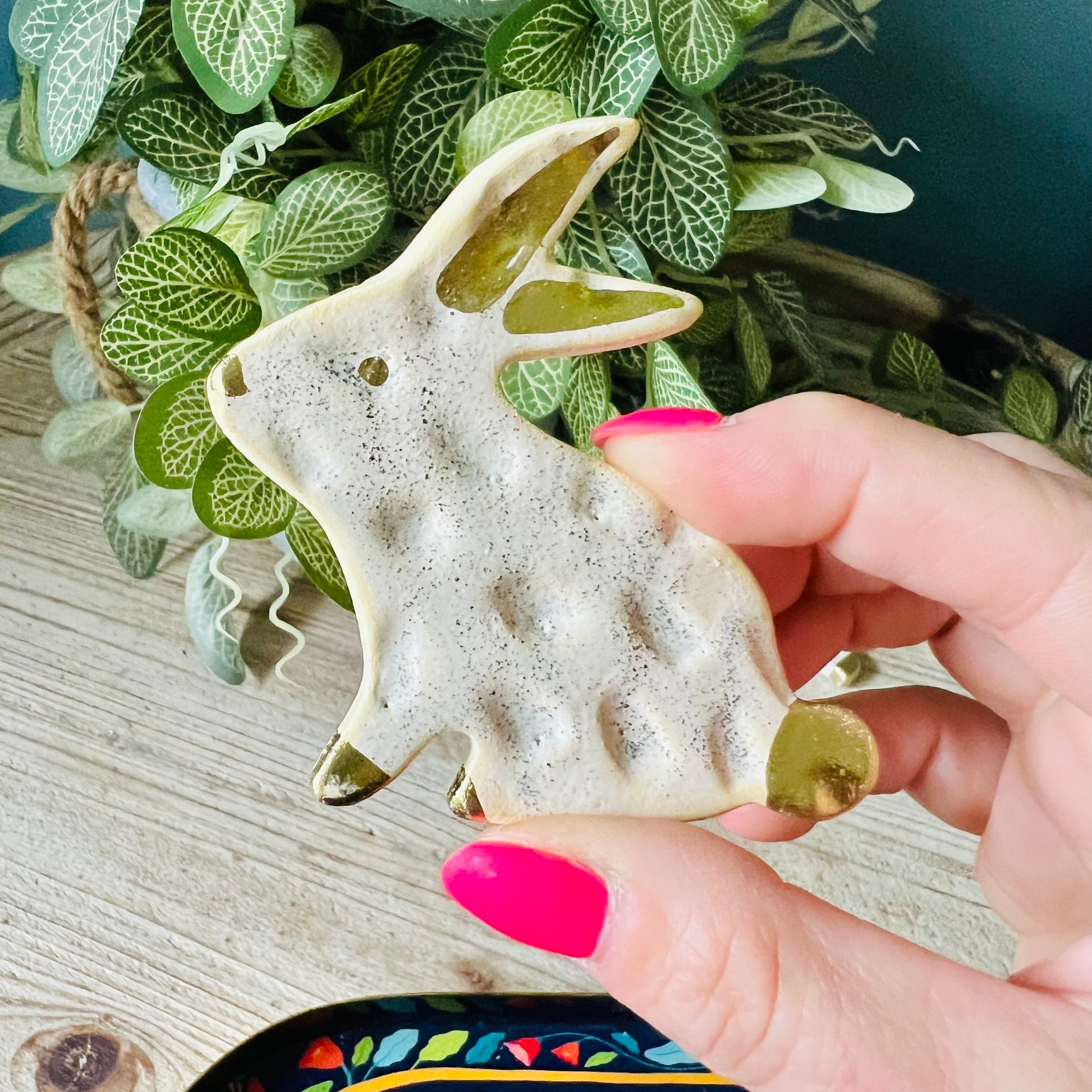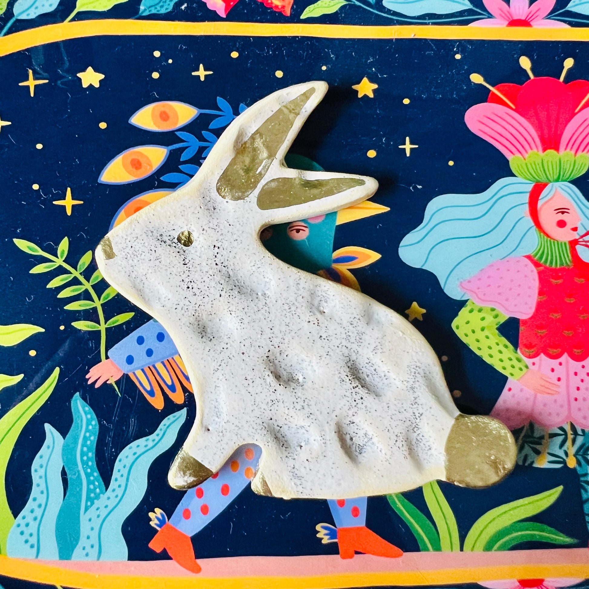 Conejito hecho en cerámica gres, esmaltado en color blanco con detalles en dorado con textura.