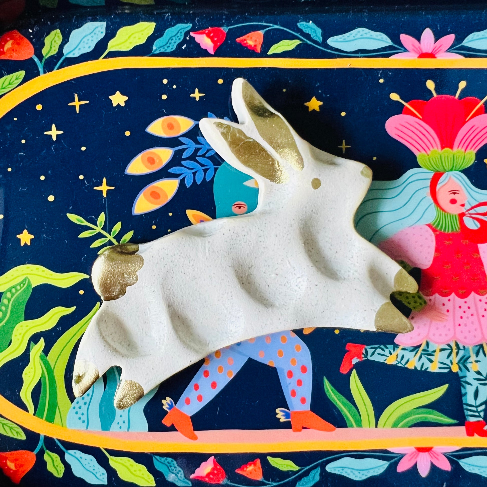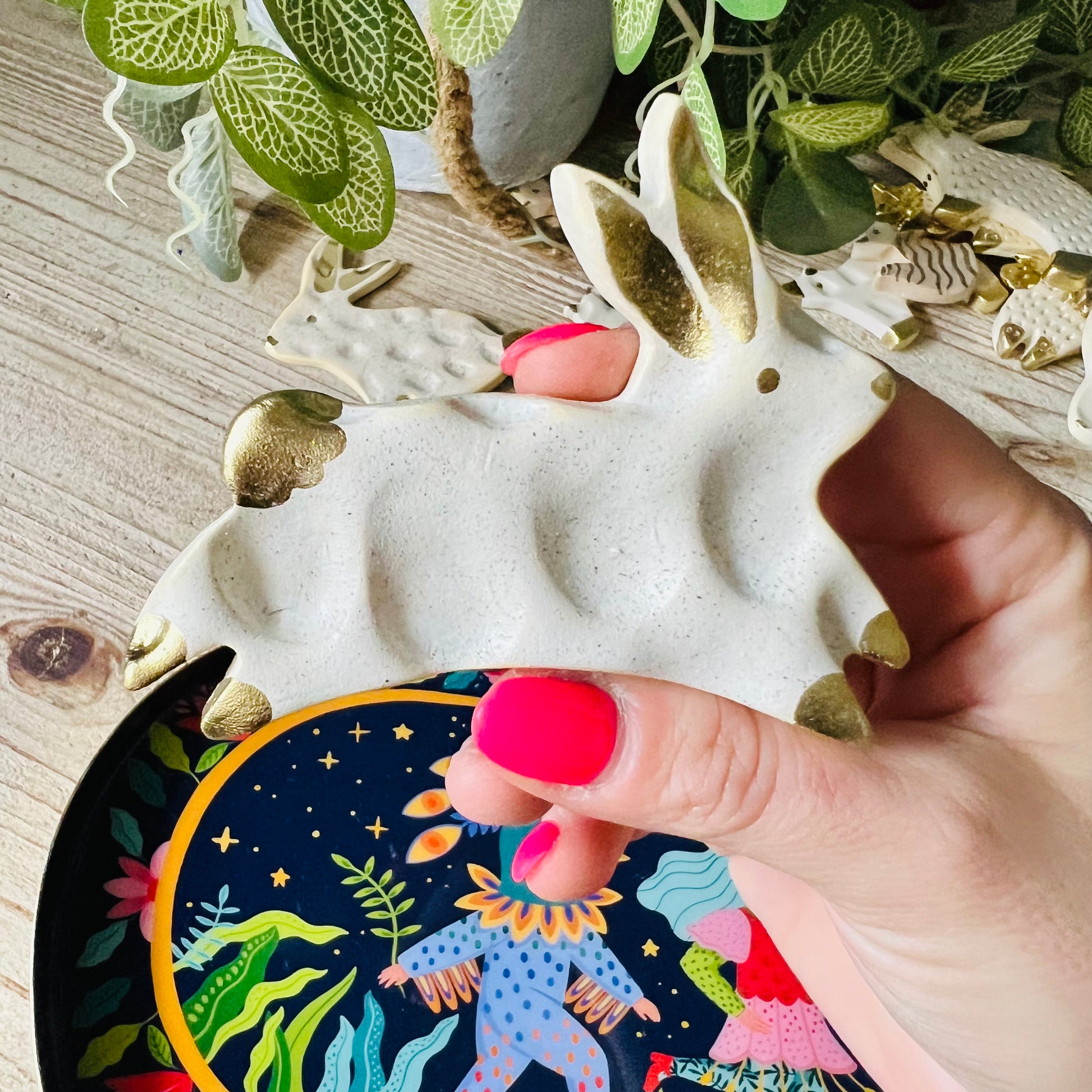 Conejito hecho en cerámica gres, esmaltado en color blanco con detalles en dorado con textura.