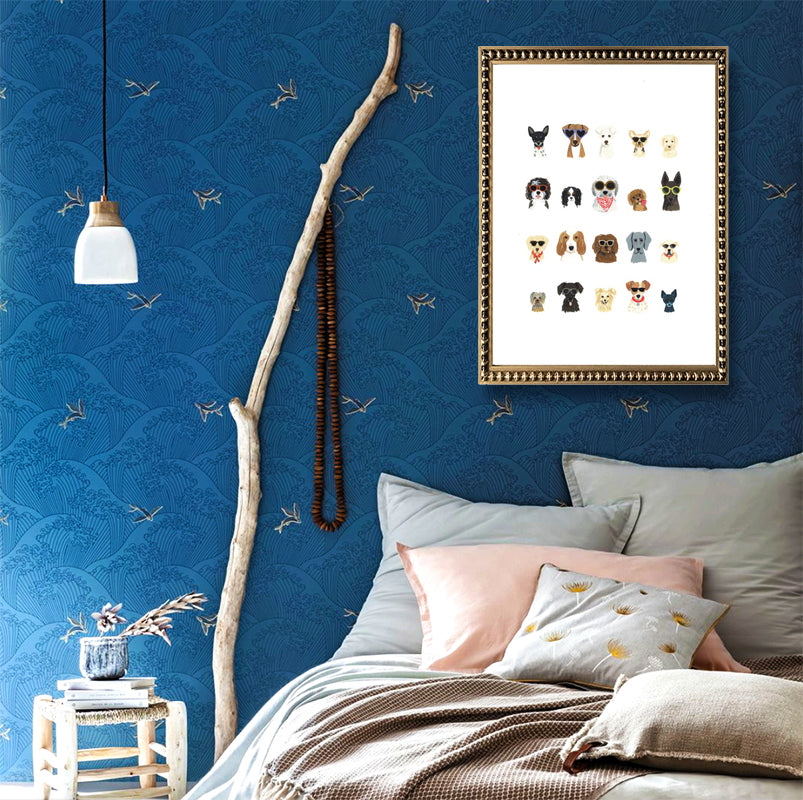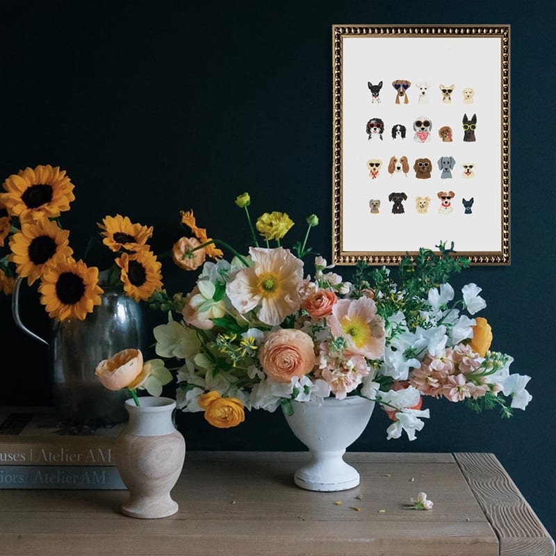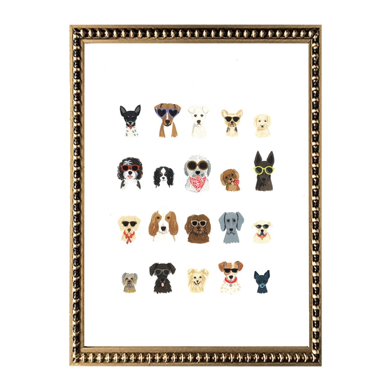 Cuadro de lámina impresa de 20 perros ilustrados con paspartú blanco en marco perla oro.