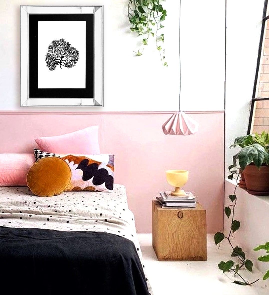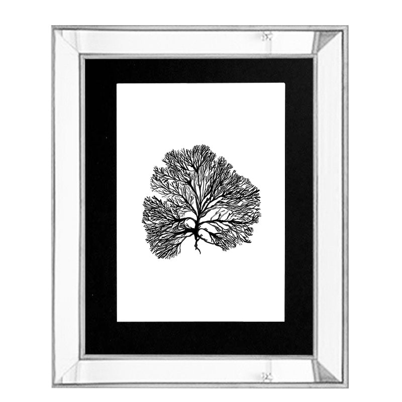 Cuadro reproducción de coral negro en acuarela con paspartú negro y marco espejo con borde color plata.