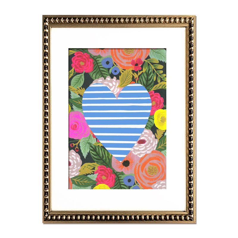 Cuadro reproducción de corazón con flores en técnica mixta con paspartú blanco y en marco de perlas dorado.