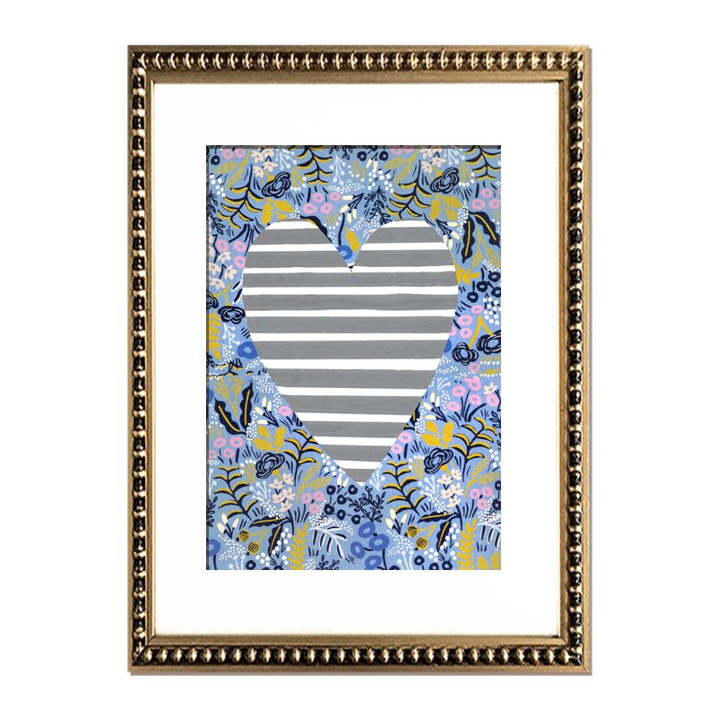 Cuadro reproducción de corazón con flores en técnica mixta con paspartú blanco y en marco de perlas dorado.
