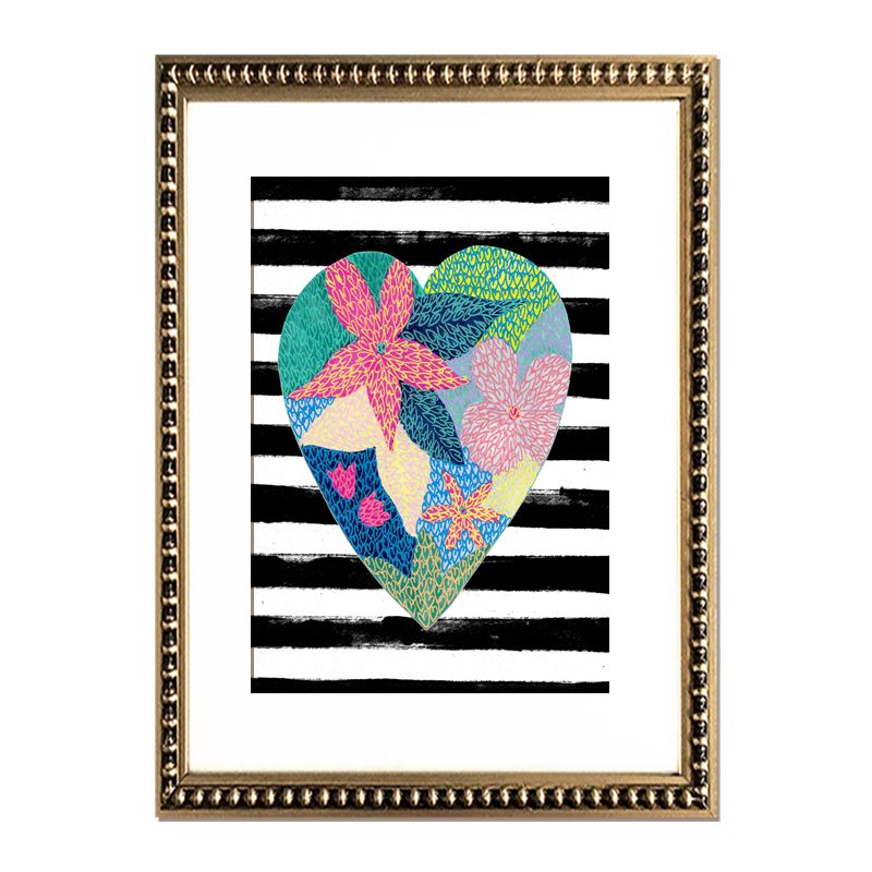 Cuadro reproducción de corazón con flores en técnica mixta con paspartú blanco y en marco de perlas dorado.