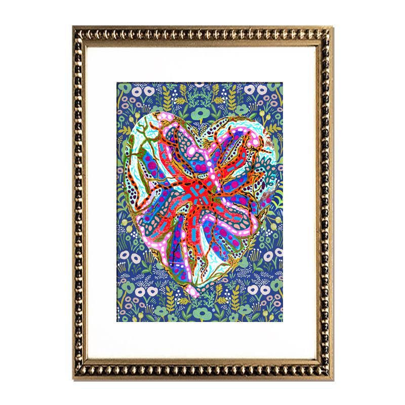 Cuadro reproducción de corazón con flores en técnica mixta con paspartú blanco y en marco de perlas dorado.
