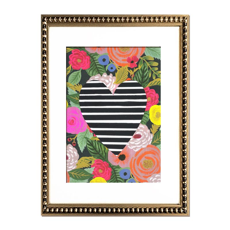 Cuadro reproducción de corazón con flores en técnica mixta con paspartú blanco y en marco de perlas dorado.