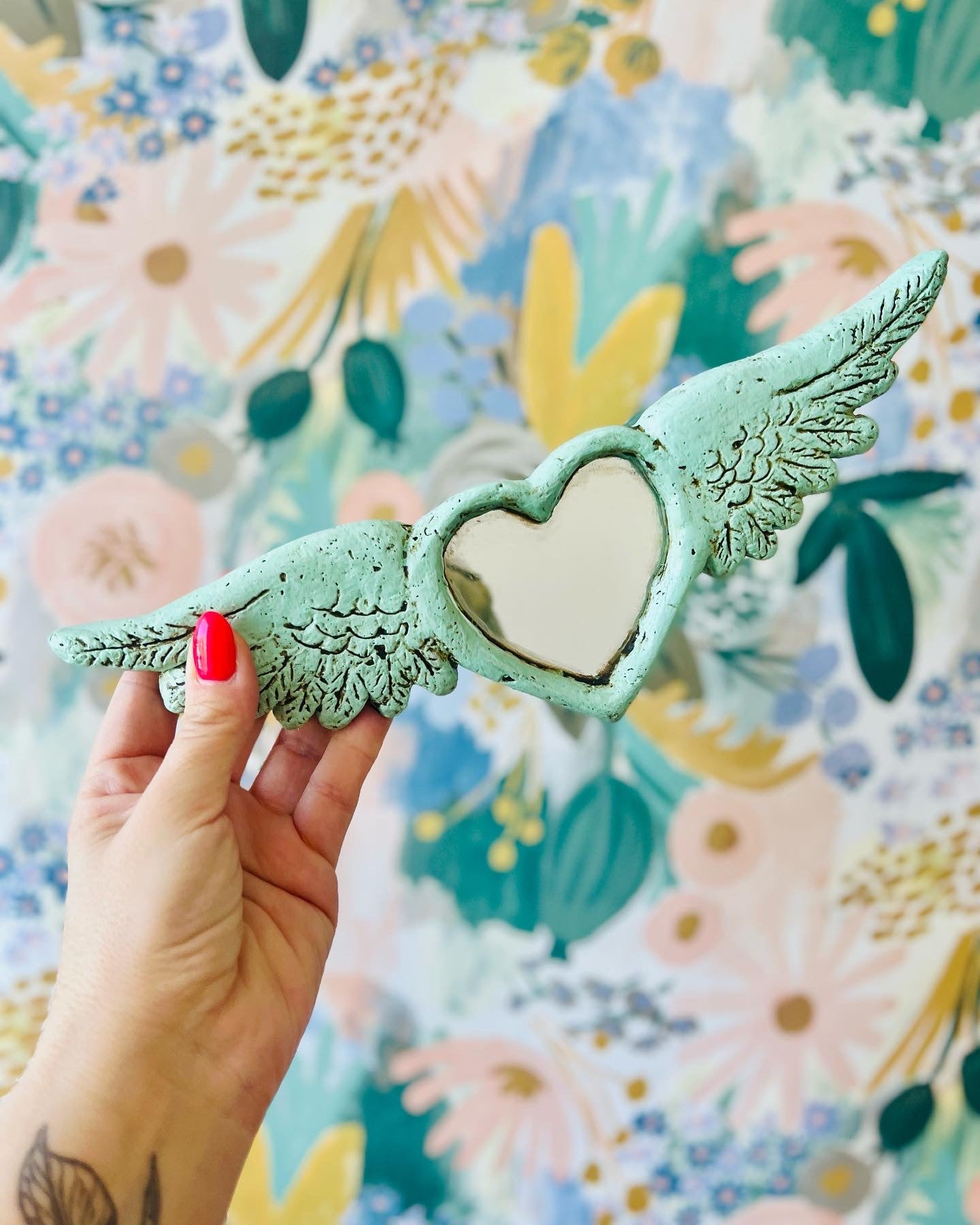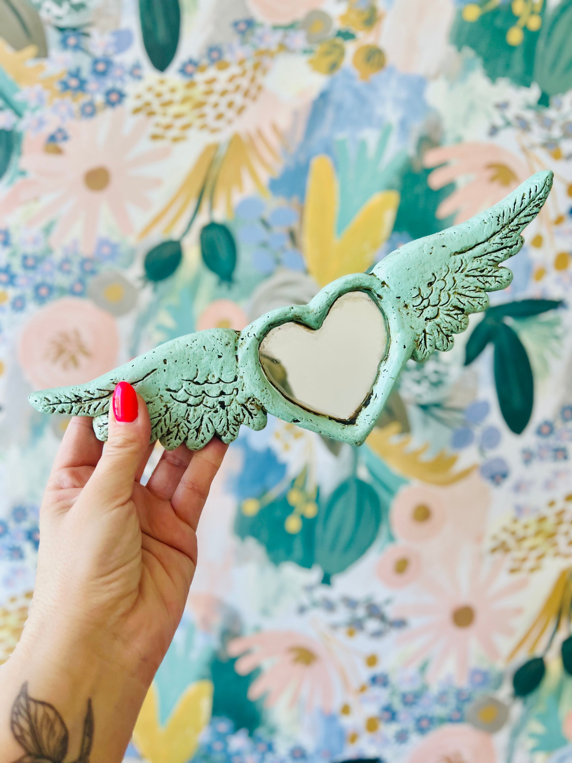 Corazón de papel maché color menta con espejo tallado para colgar.