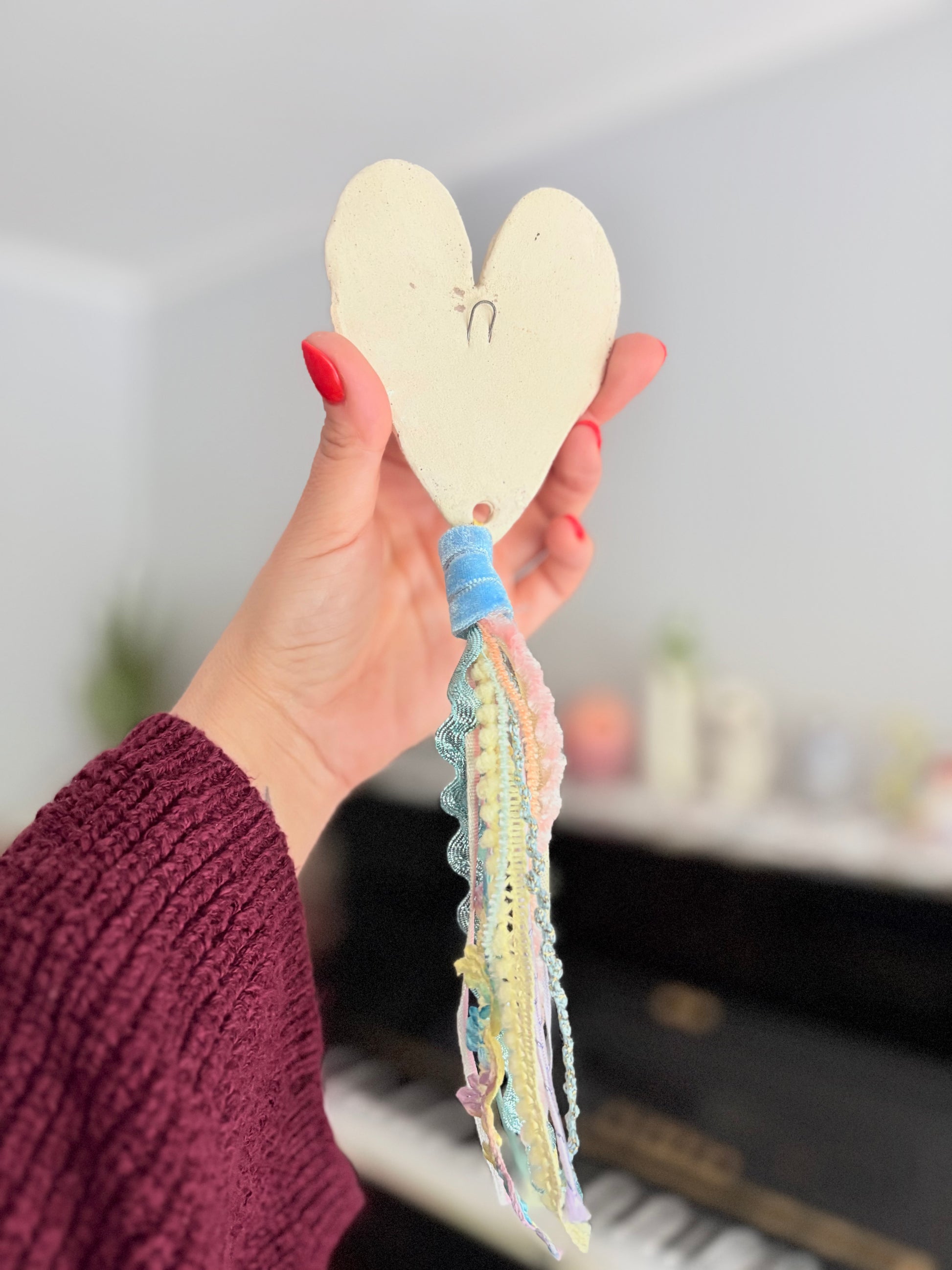 Corazón hecho en cerámica gres, con ganchito por atrás para colgar y flecos de colores.