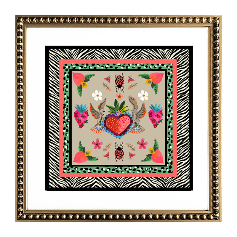 Cuadros de ilustración digital de corazones mexicanos y colores, con paspartú blanco y marco perla oro.