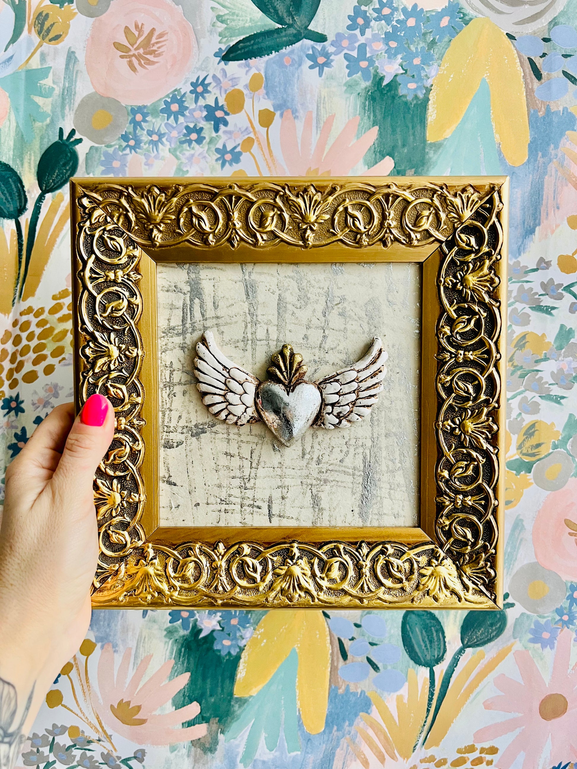 Mini cuadrito de corazón de papel maché sobre papel importado con texturas en papel de tela en algodón y marco de madera con detalles dorados.