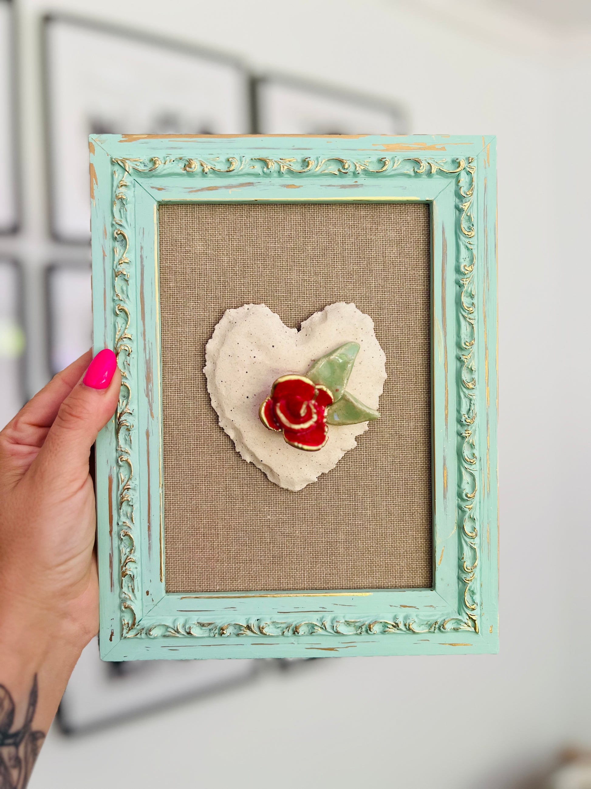 Cuadro de corazón de cerámica sobre lino natural y marco menta de madera con detalles dorado.