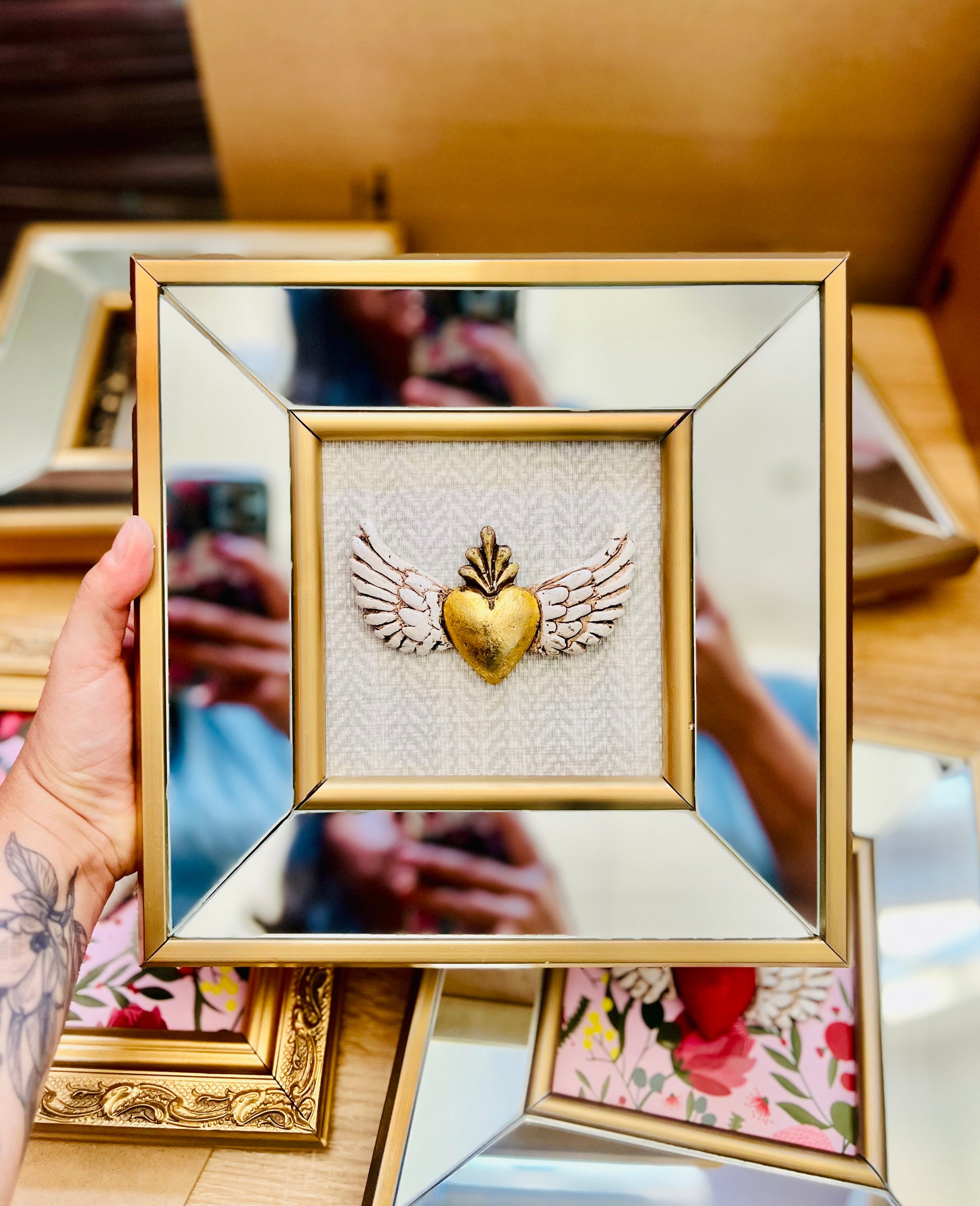 Cuadrito de corazón con alas hecho en papel maché sobre papel importado con diseño de flores en colores y marco de madera plata con espejo.