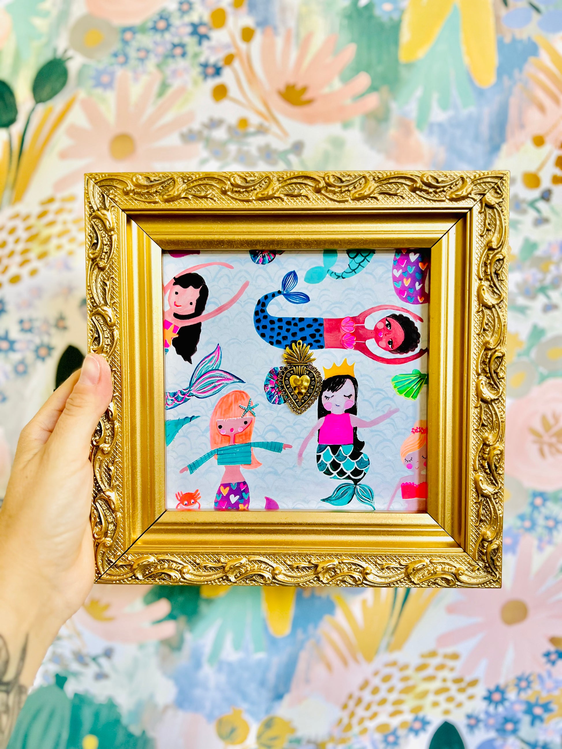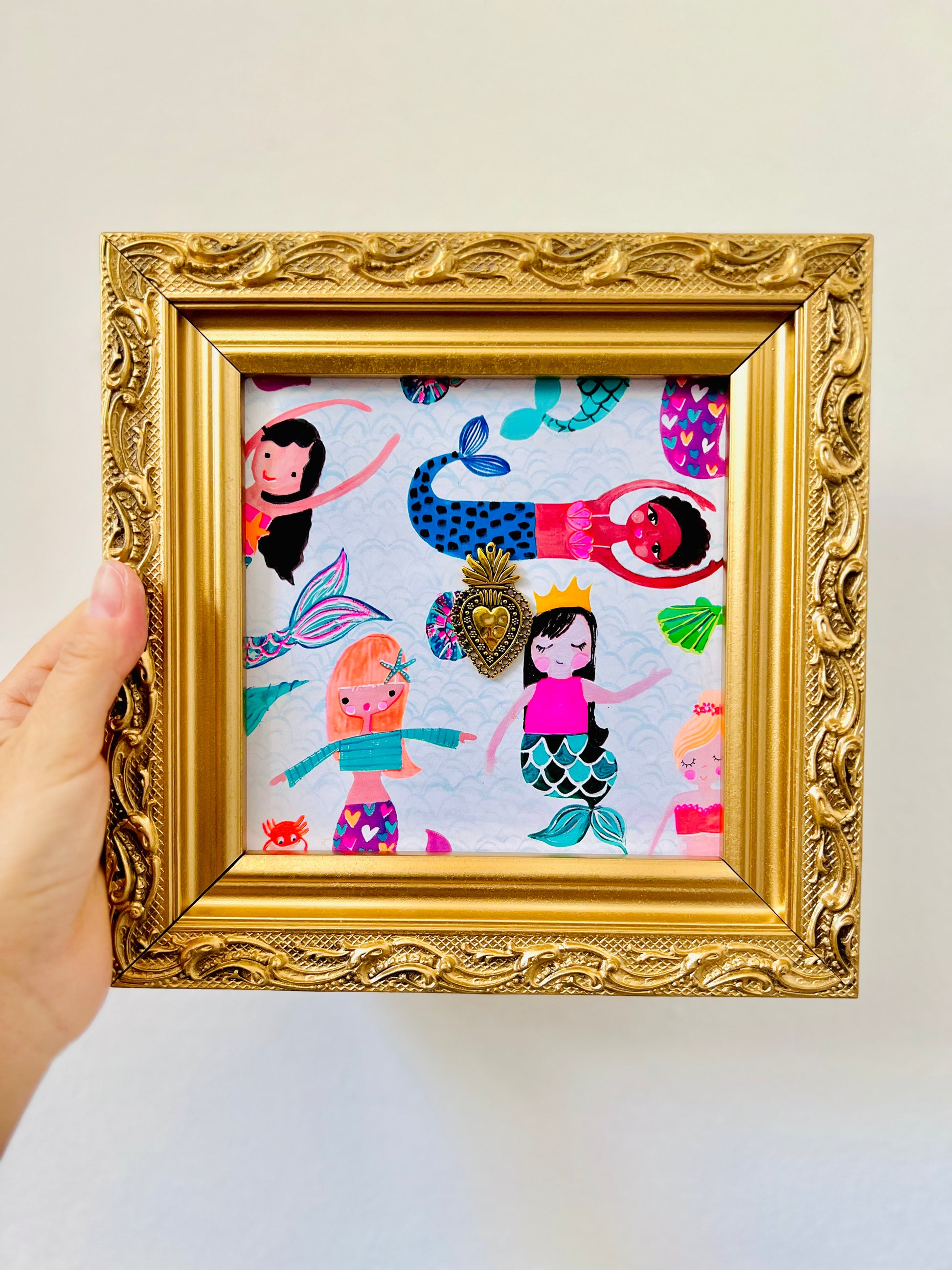 Cuadrito de corazón detente mexicano dorado sobre papel importado con diseño de sirenas en colores y marco de madera con detalles dorados.