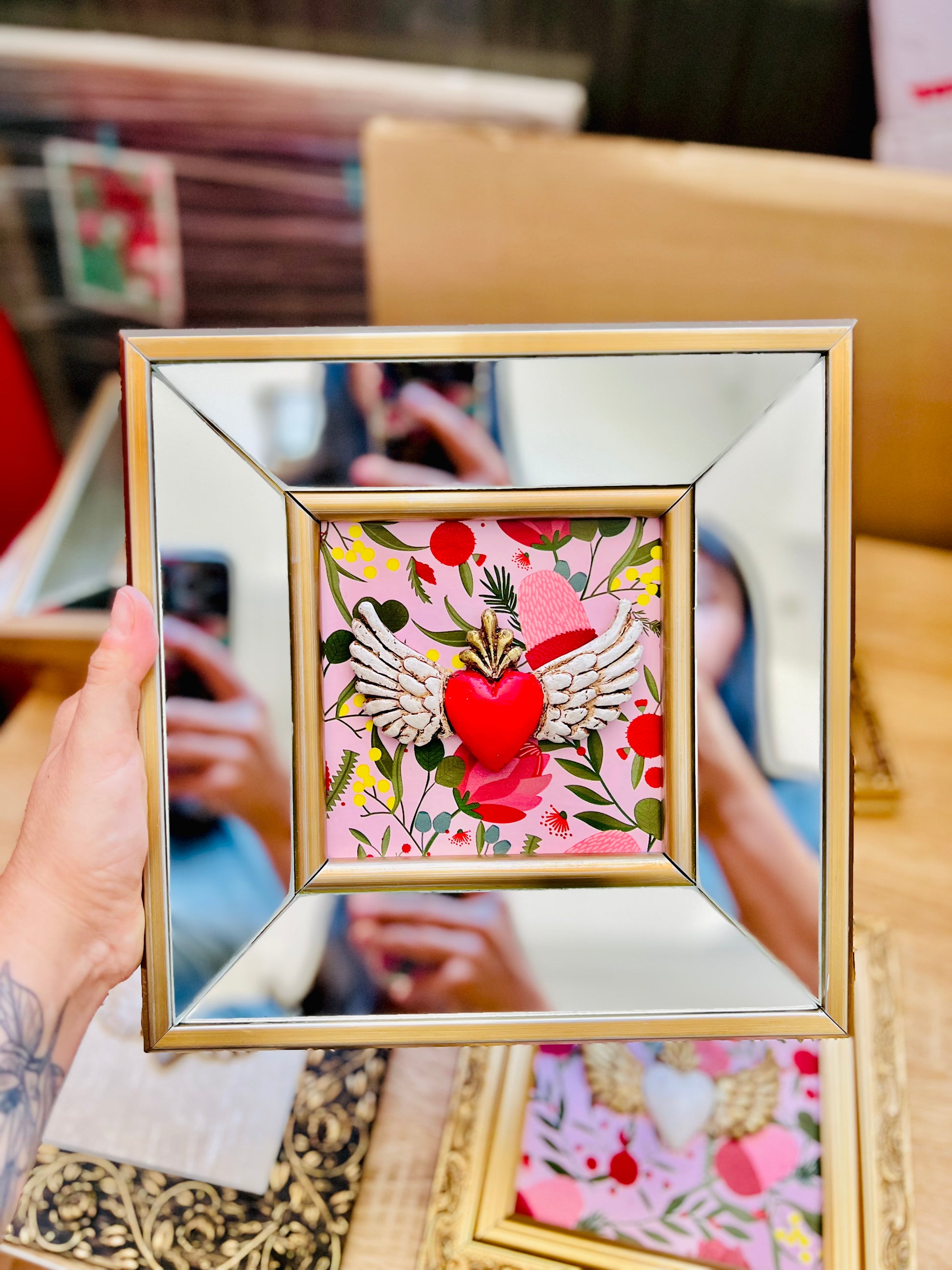 Cuadrito de corazón con alas hecho en papel maché sobre papel importado con diseño de flores en colores y marco de madera dorado con espejo.