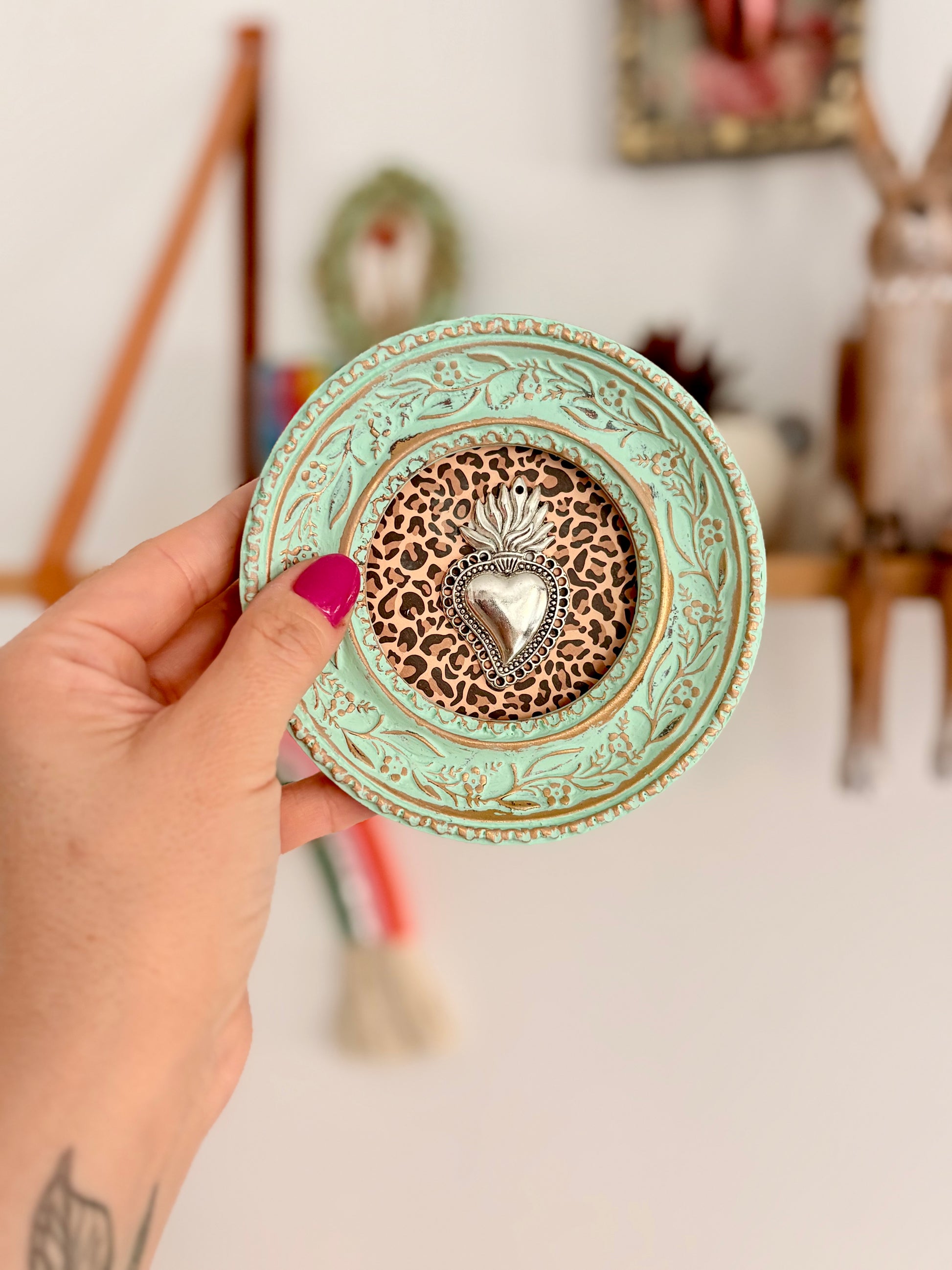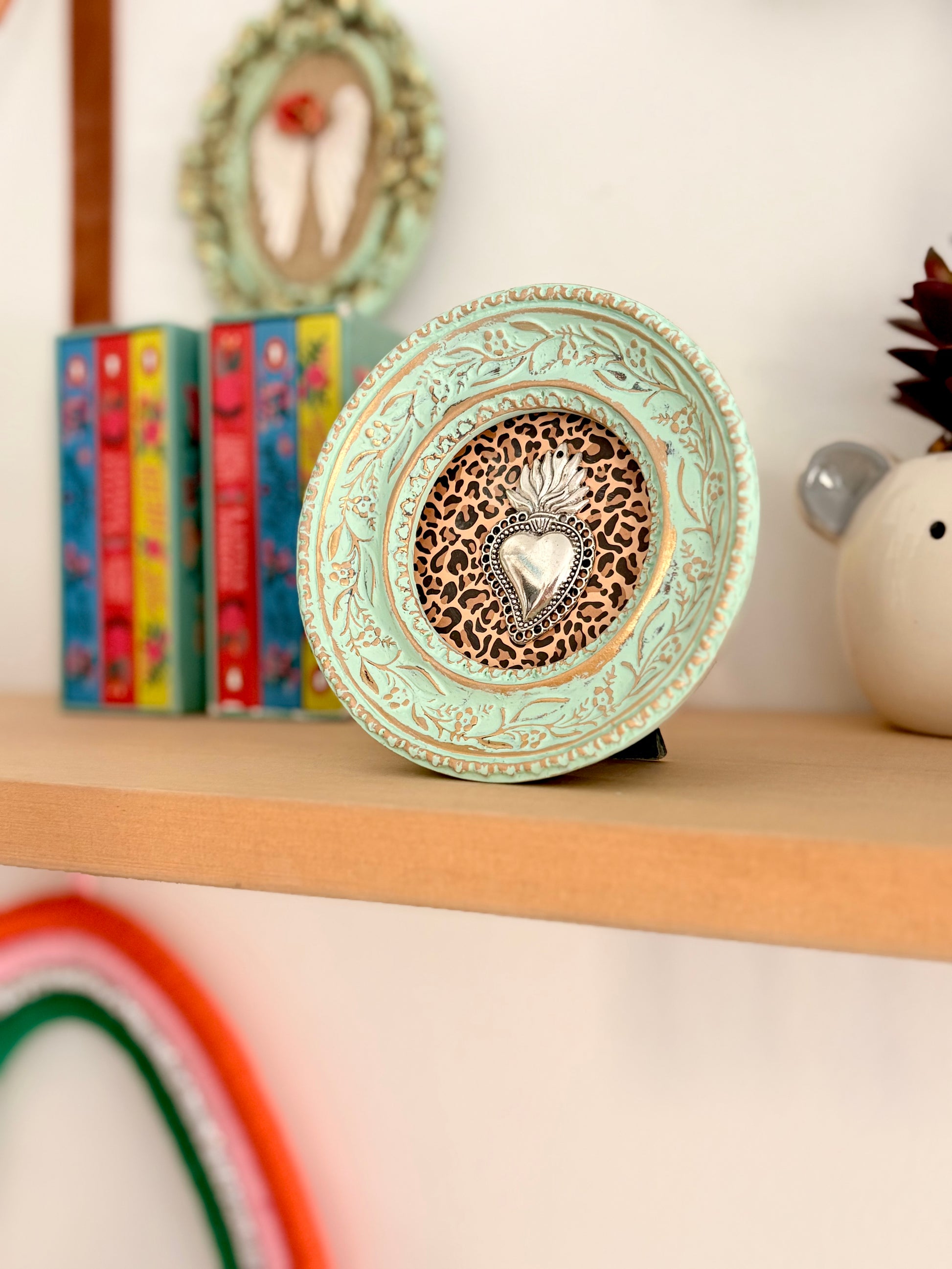 Mini cuadrito de corazón sobre papel texturado, en marco envejecido redondo.