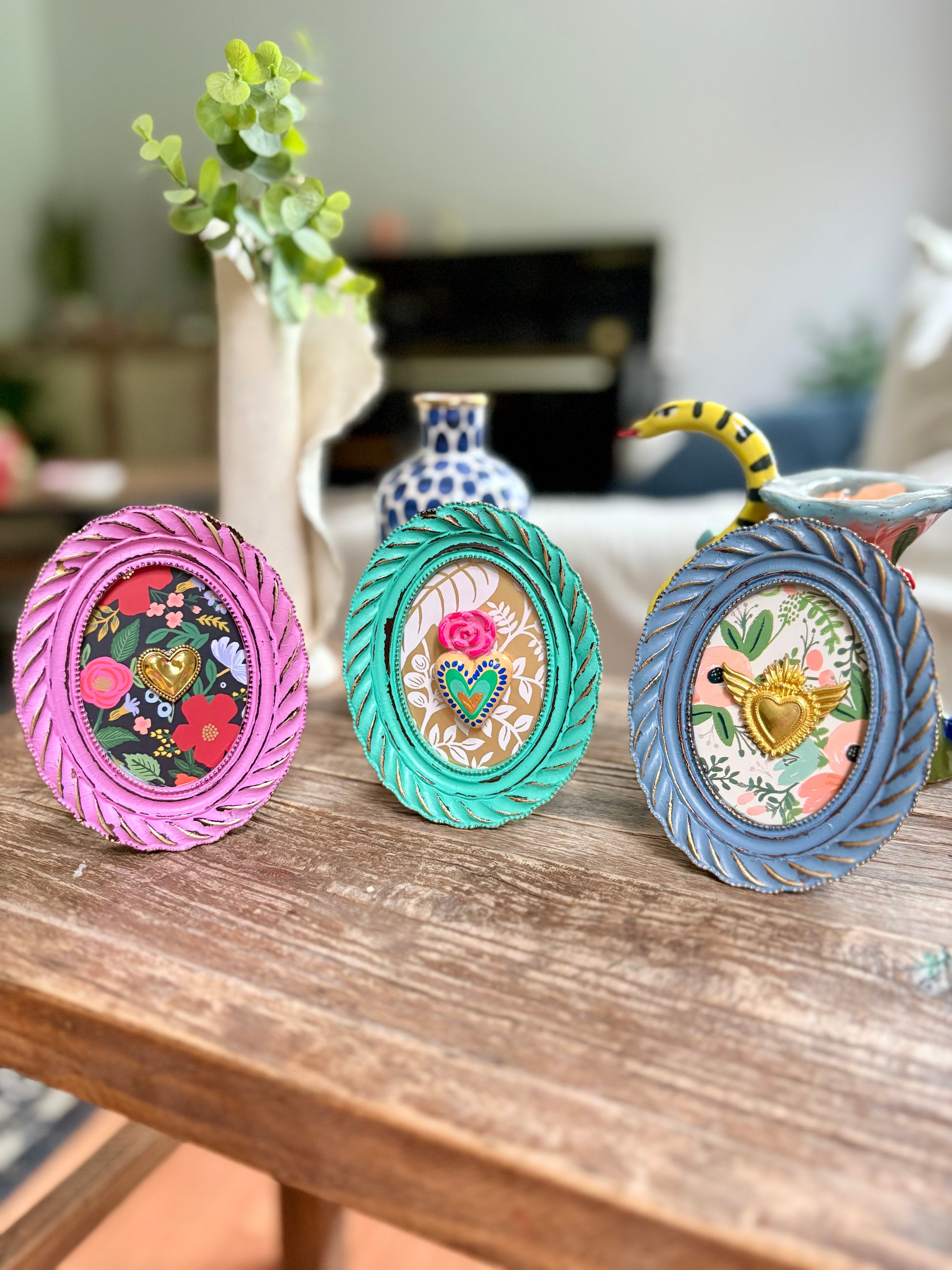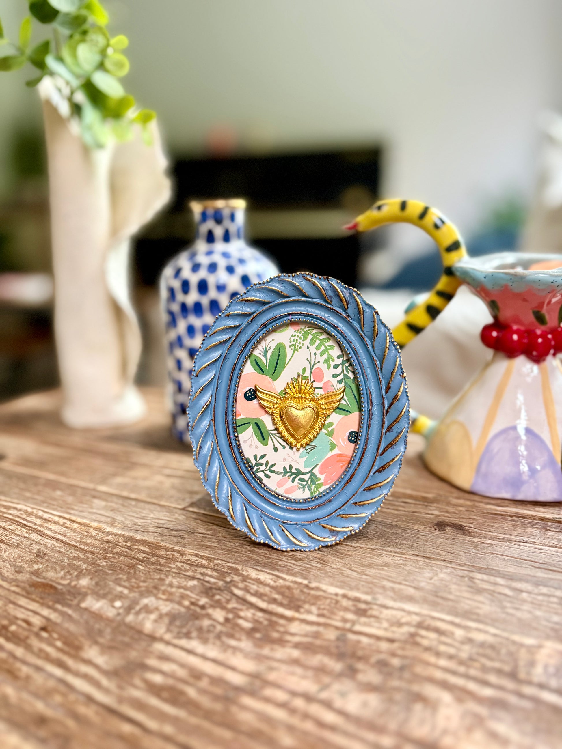 Mini cuadrito de corazón sobre papel texturado, en marco envejecido ovalado.