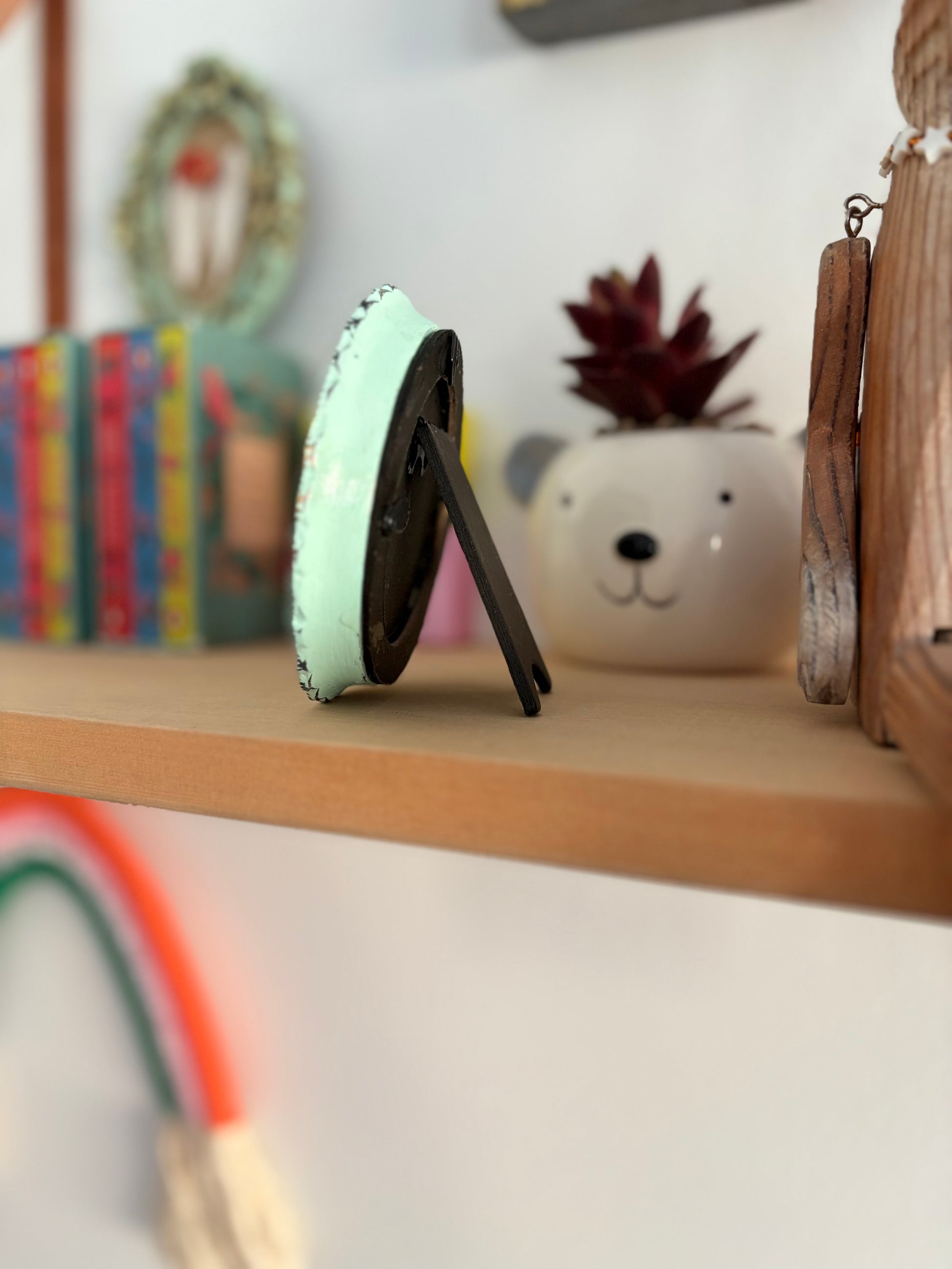 Puedes colgarlo o usarlo como adorno sobre una repisa o mueble ya que cuenta con un soporte que lo sostiene.