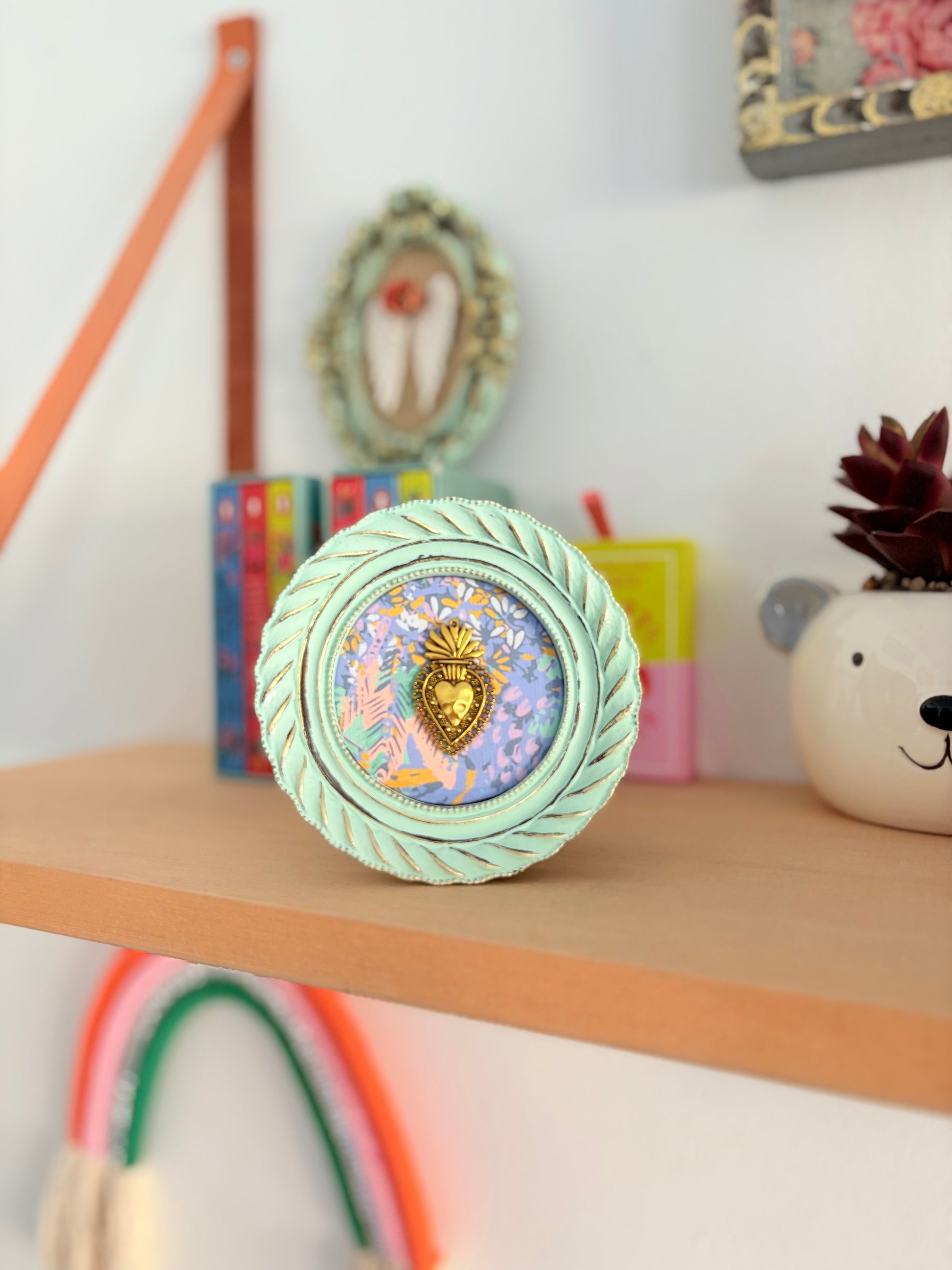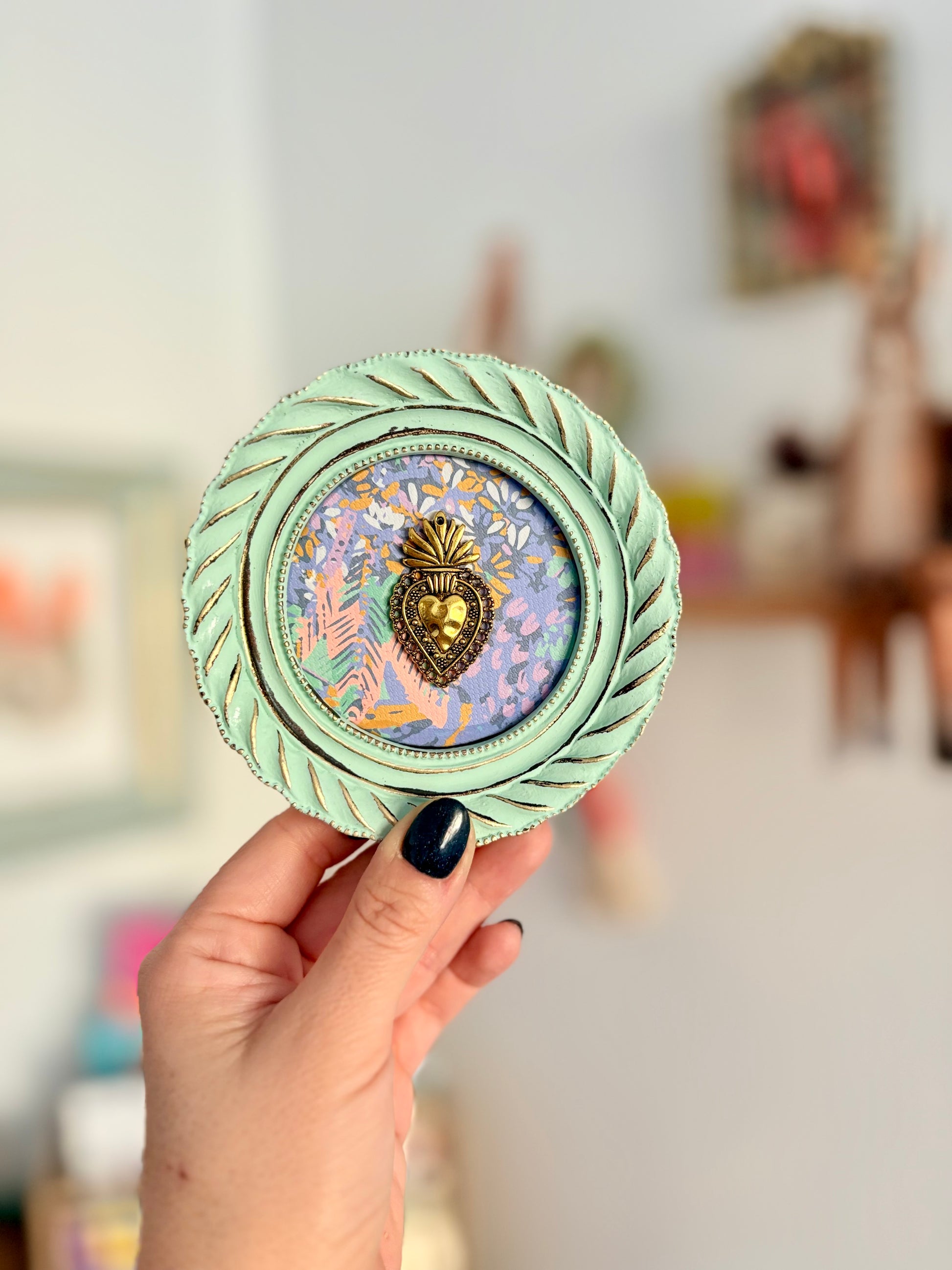 Mini cuadrito de corazón sobre papel texturado, en marco envejecido redondo.