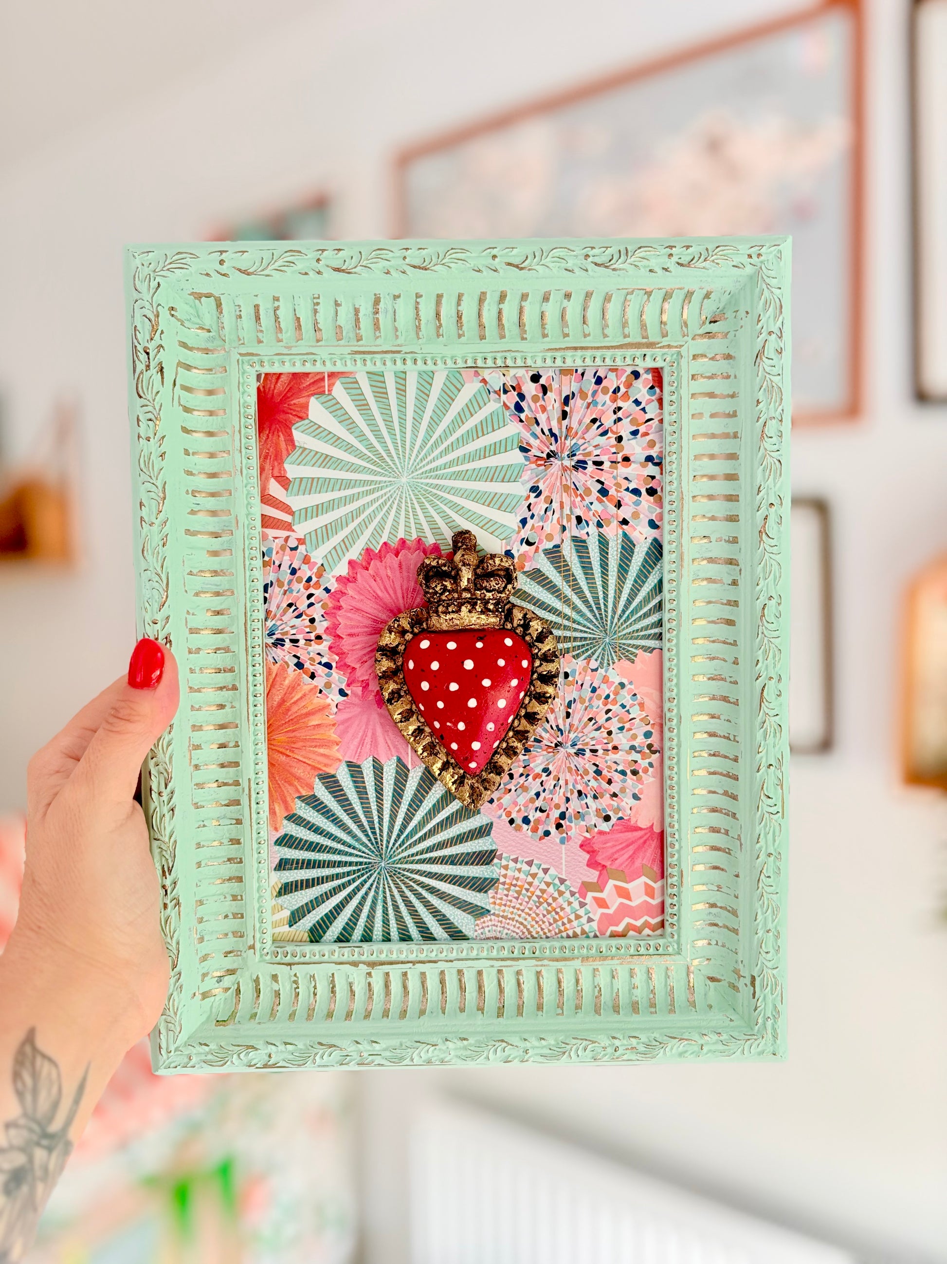 Cuadro de corazón rojo y puntitos blancos queen en fondo de papel con diseño de flores y hojas con textura en marco grueso de madera mint con detalles dorado envejecido.