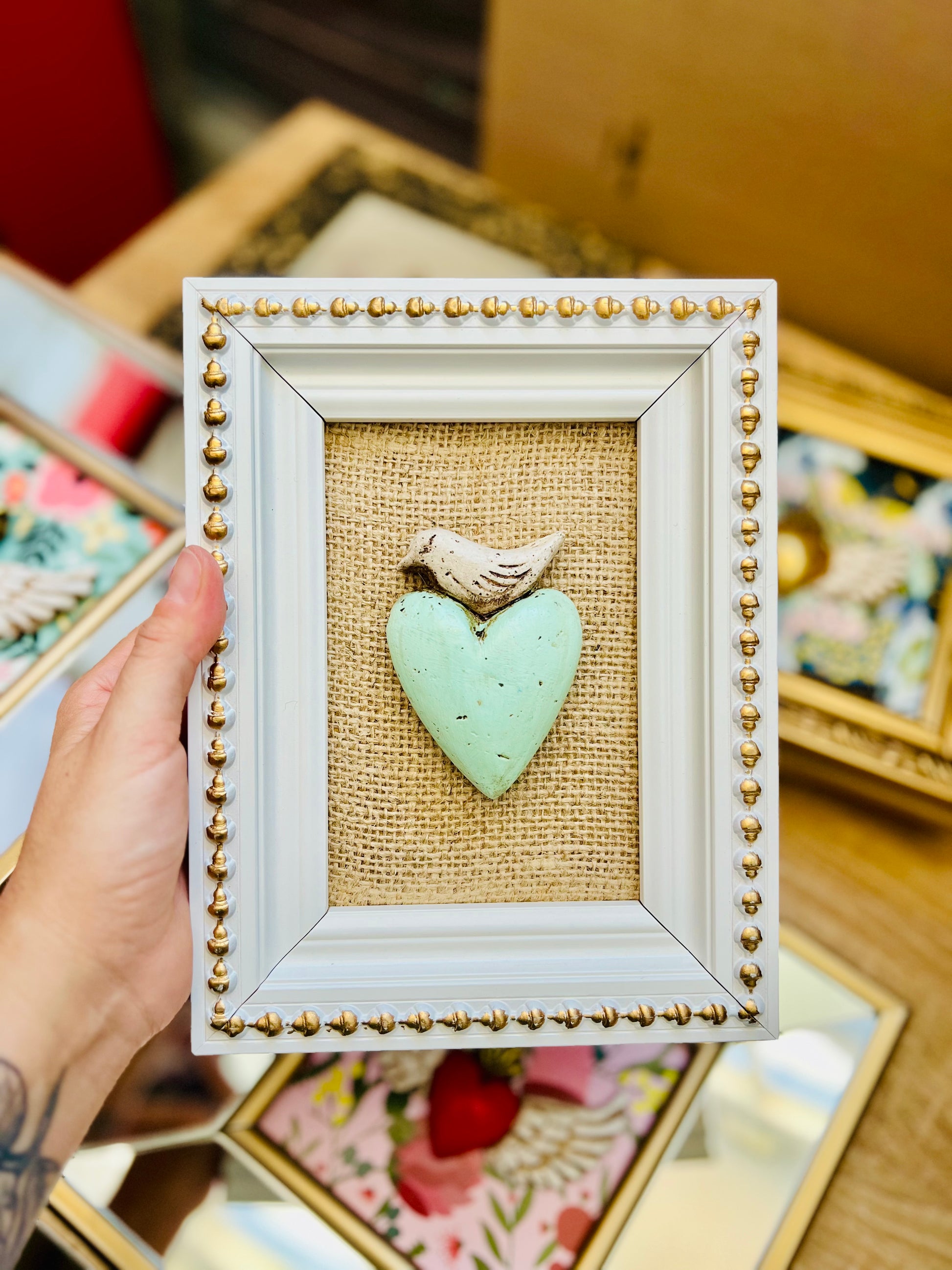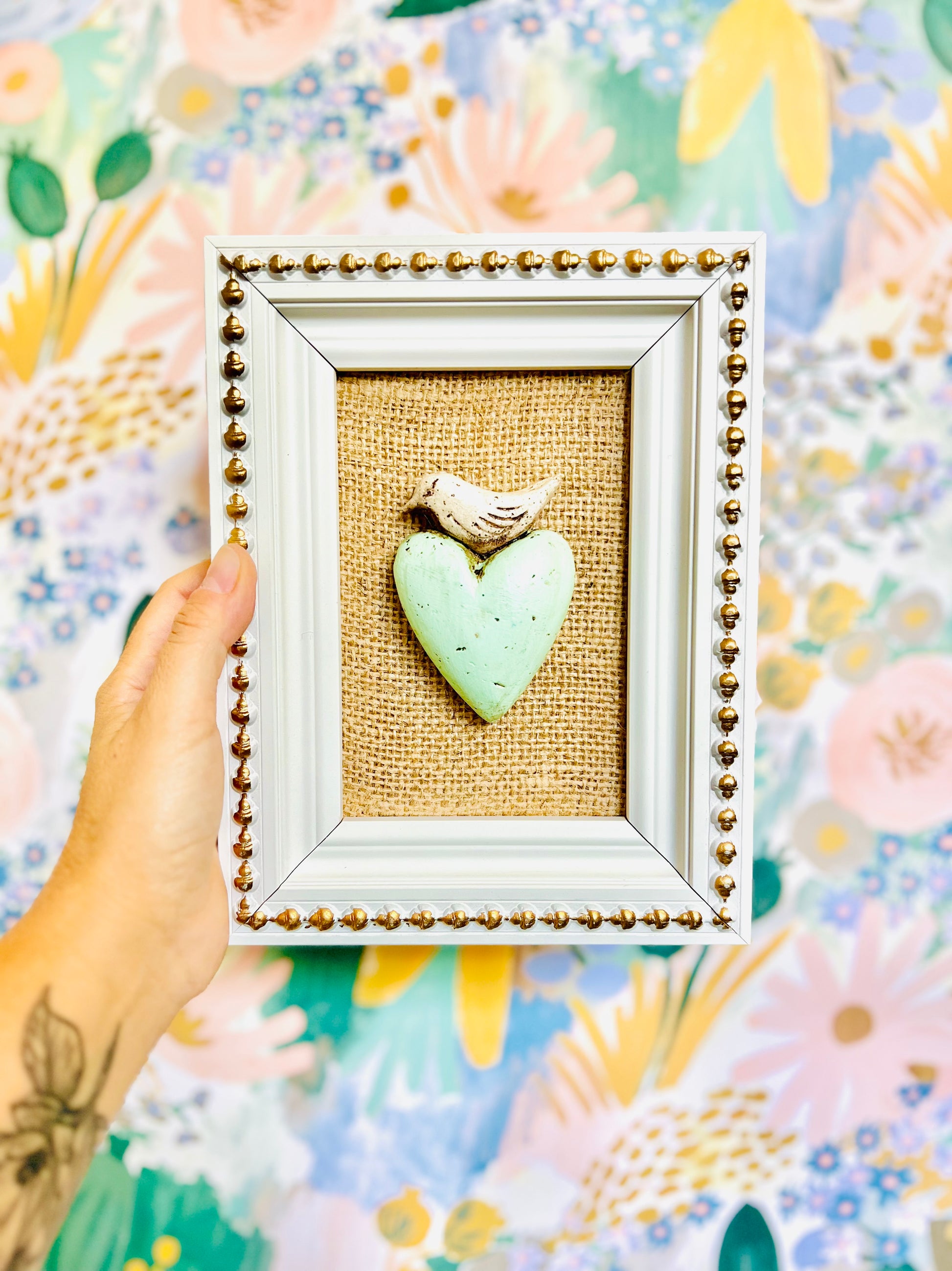 Cuadro de corazón de papel maché sobre tela de yute natural y marco blanco de madera con detalles dorado.