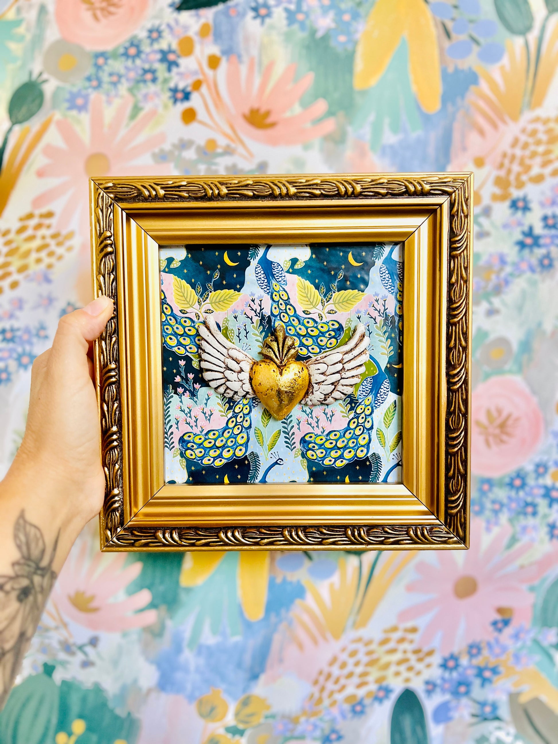 Cuadrito de corazón con alas hecho en papel maché sobre papel importado con diseño de flores y pavos reales en colores y marco de madera con detalles dorados.