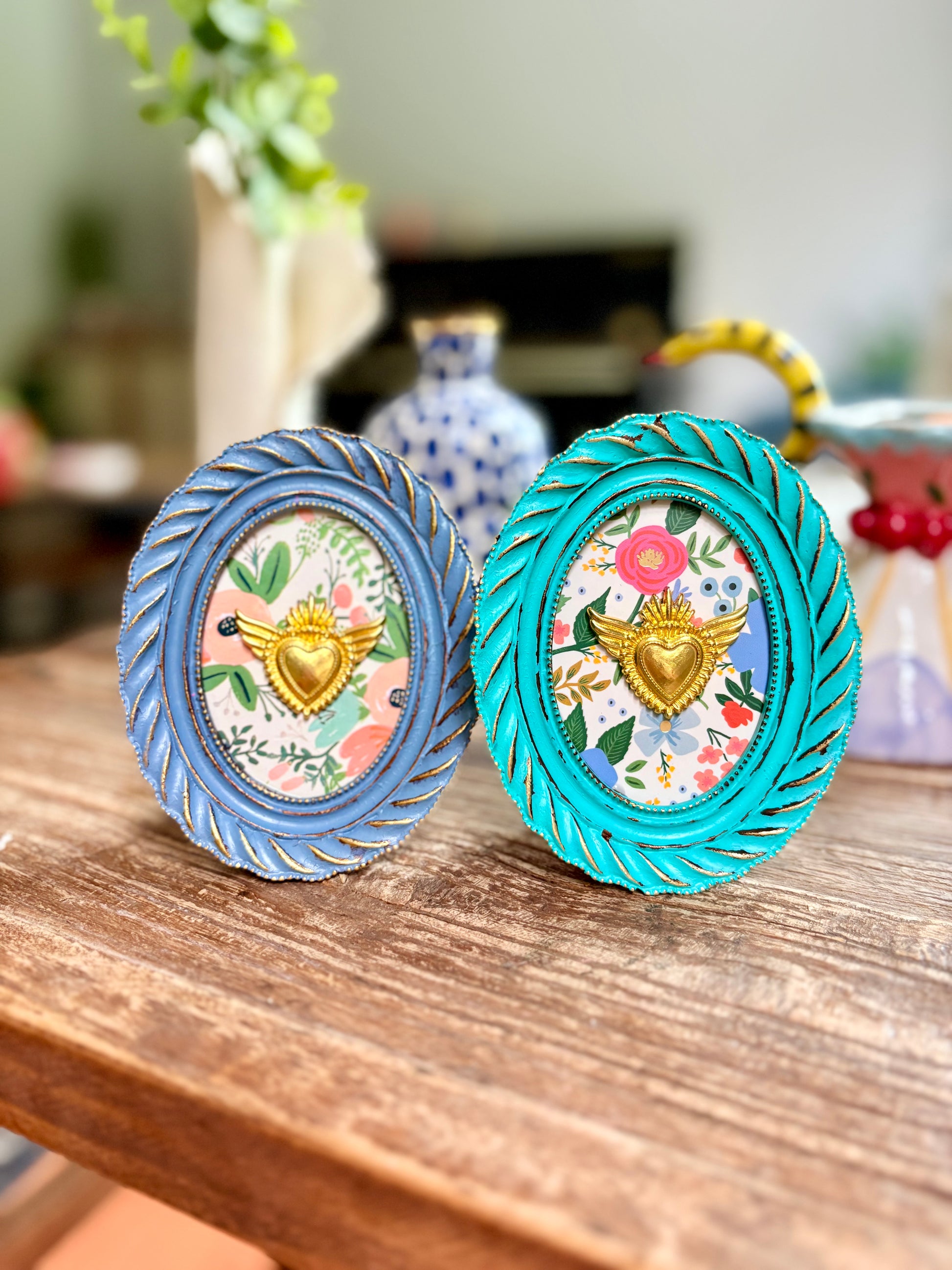 Mini cuadrito de corazón sobre papel texturado, en marco envejecido ovalado.