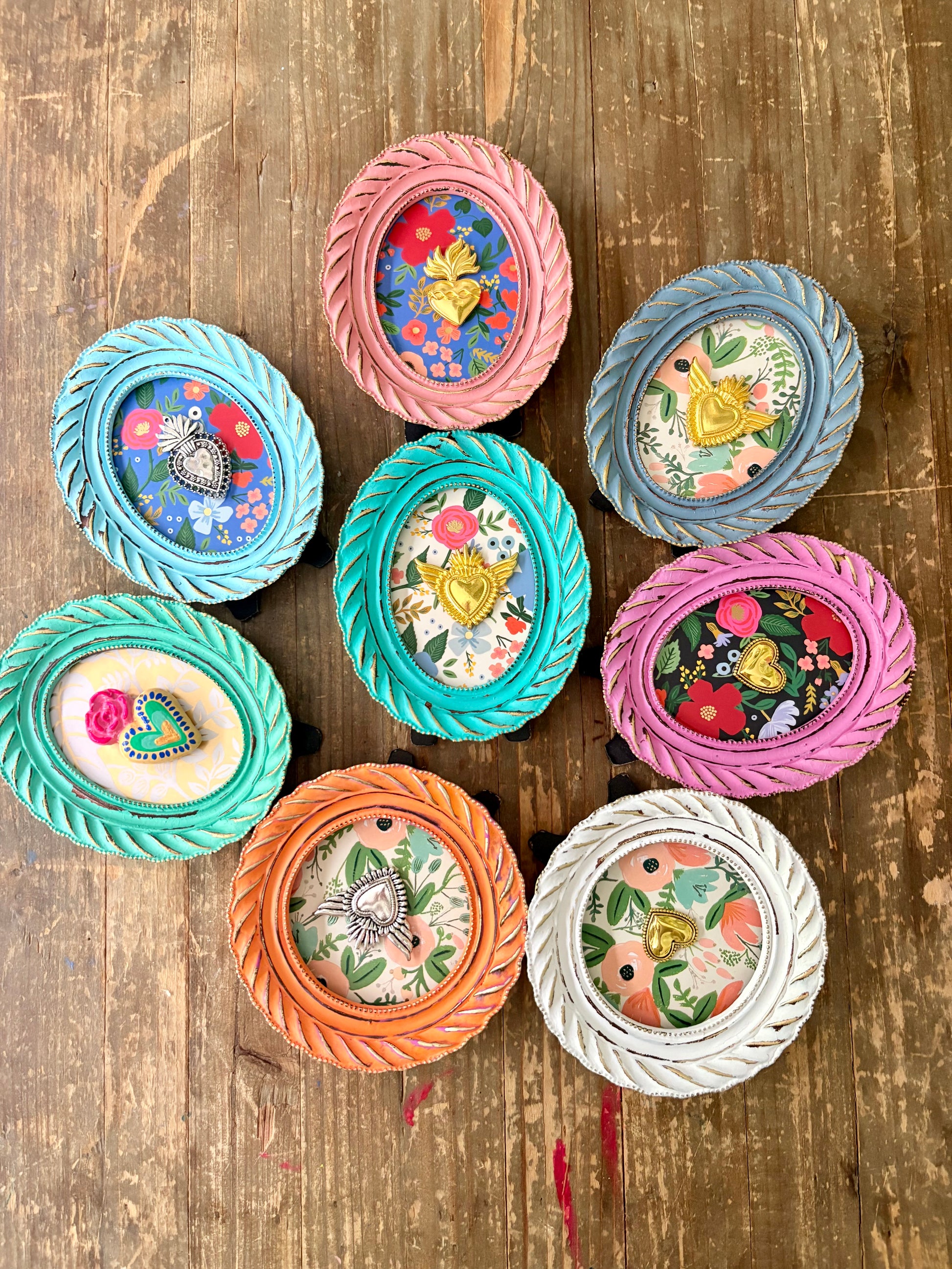 Mini cuadrito de corazón sobre papel texturado, en marco envejecido redondo.