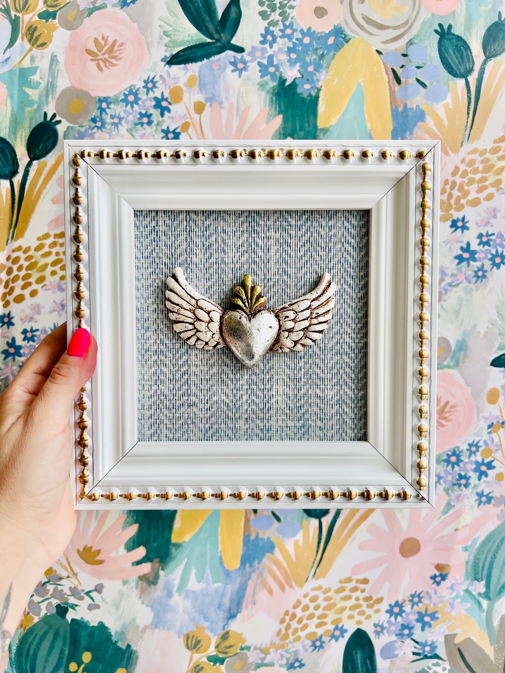 Mini cuadrito de corazón de papel maché sobre papel importado de flores y marco de madera blanco con detalles dorado envejecido.