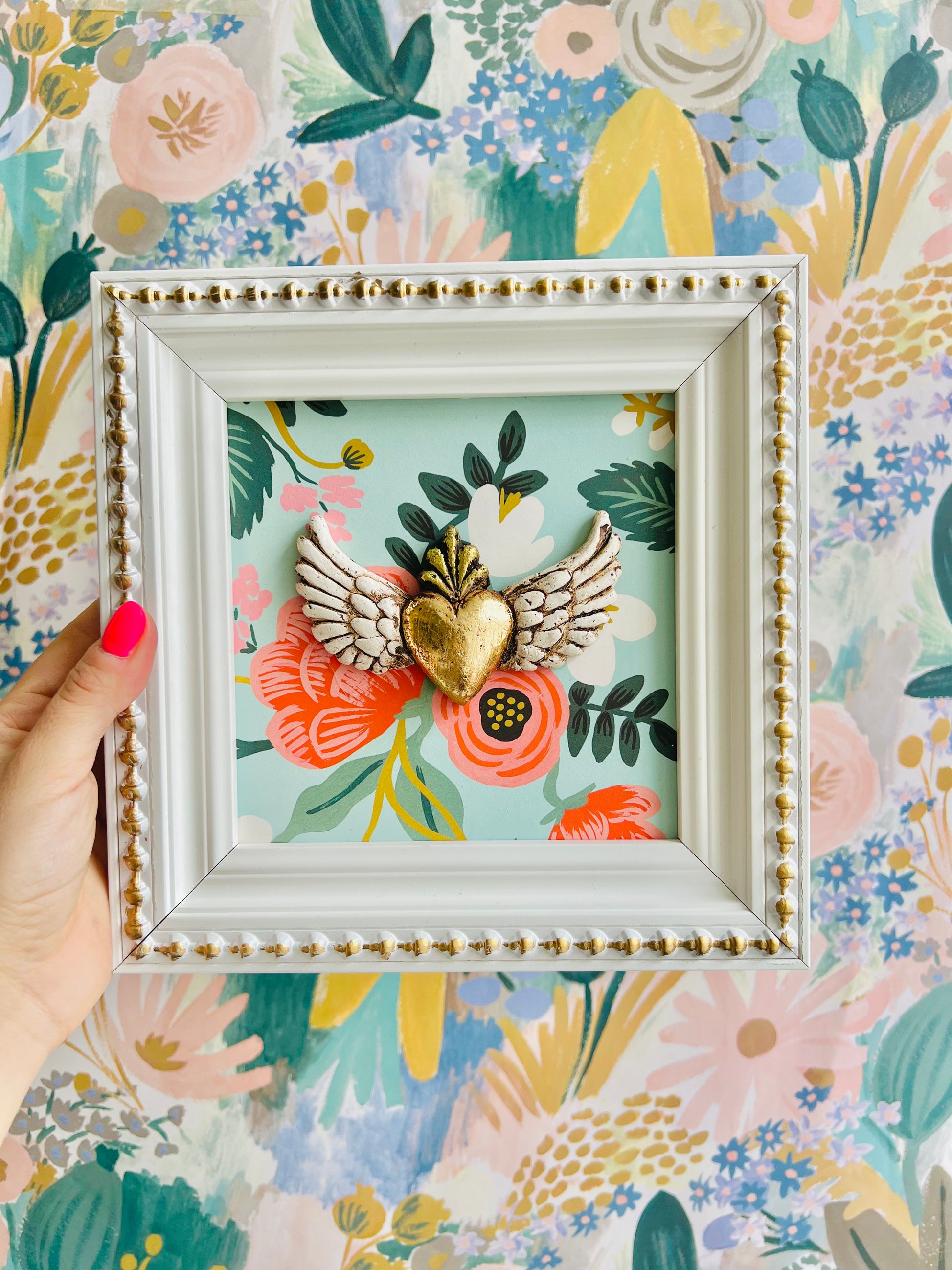Mini cuadrito de corazón de papel maché sobre papel importado de flores y marco blanco de madera con detalles dorado envejecido.