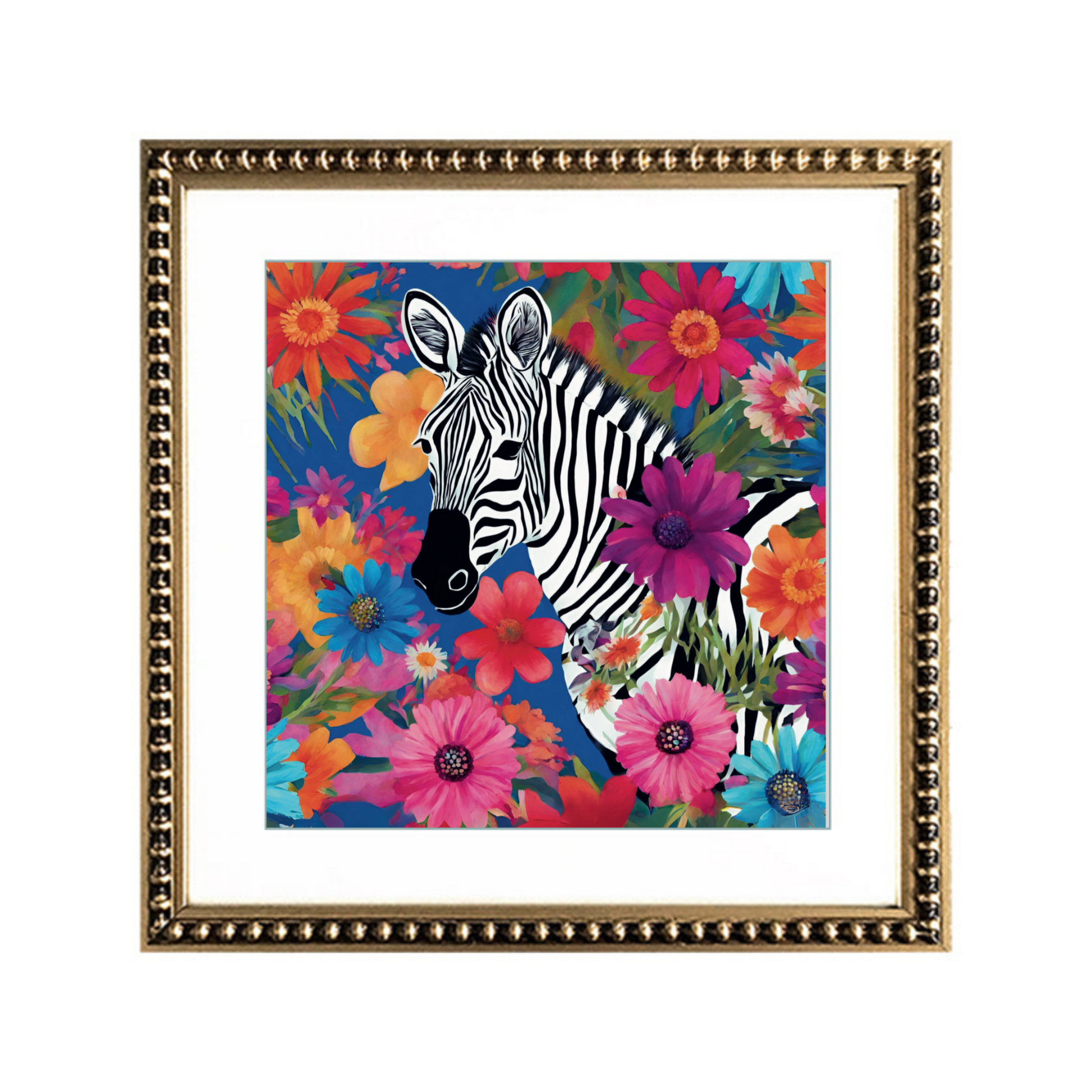 Cuadro con diseño de cebra sobre fondo de flores, paspartú blanco y marco de madera delgado dorado con perlitas.