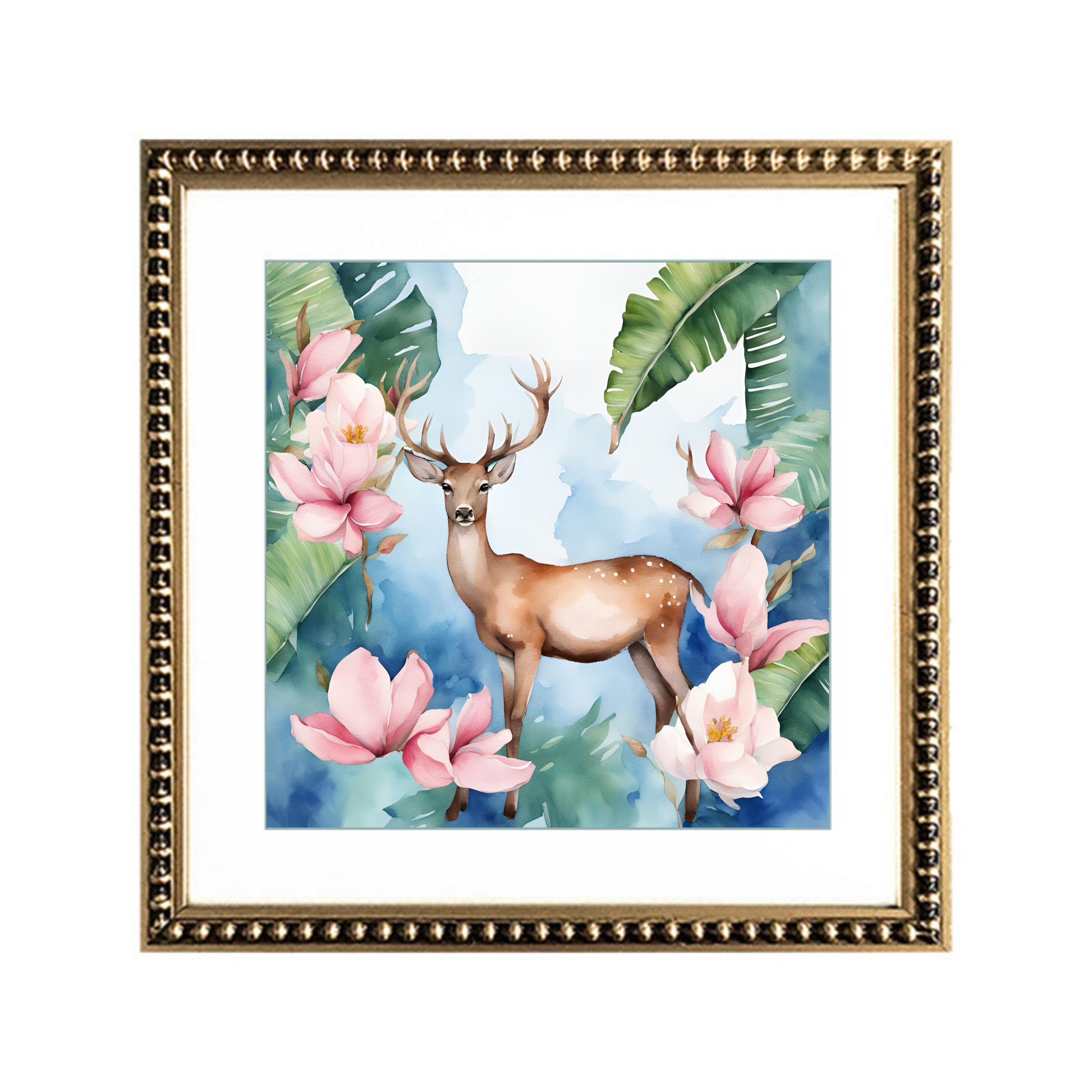 Cuadro con diseño de ciervo con selva de hojas y flores en acuarela, paspartú blanco y marco de madera delgado dorado con perlitas.