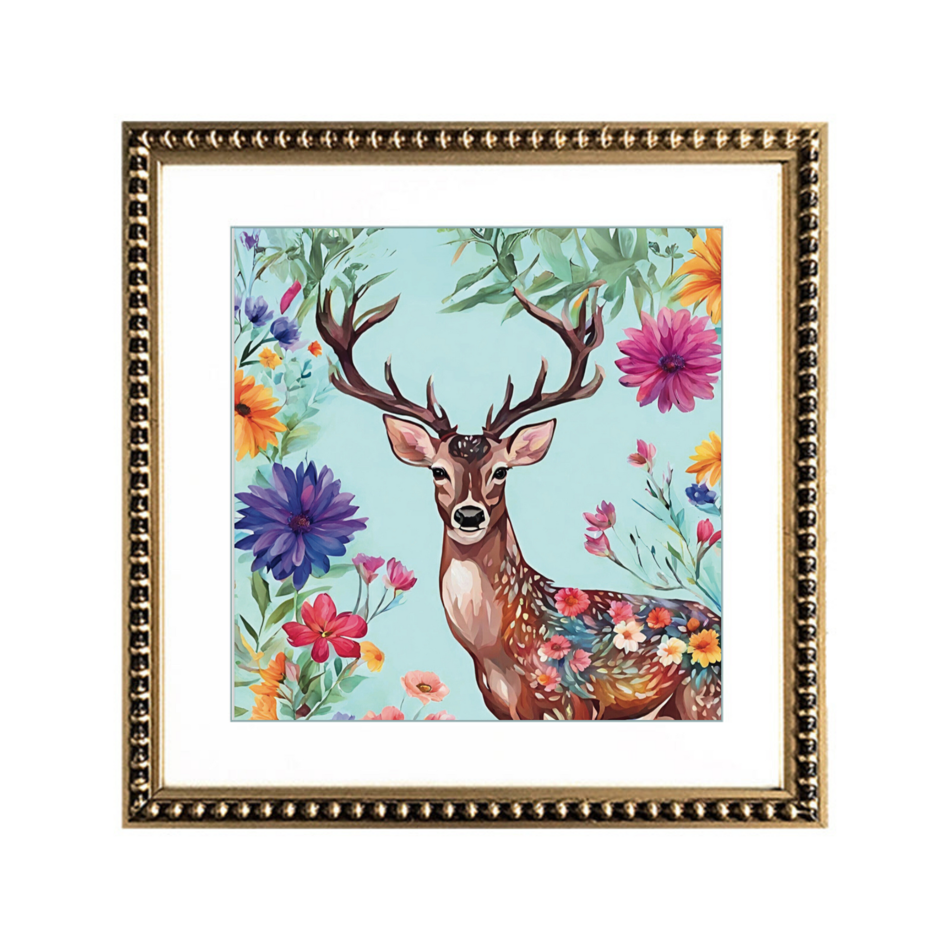 Cuadro con diseño de ciervo sobre fondo de flores, paspartú blanco y marco de madera delgado dorado con perlitas.