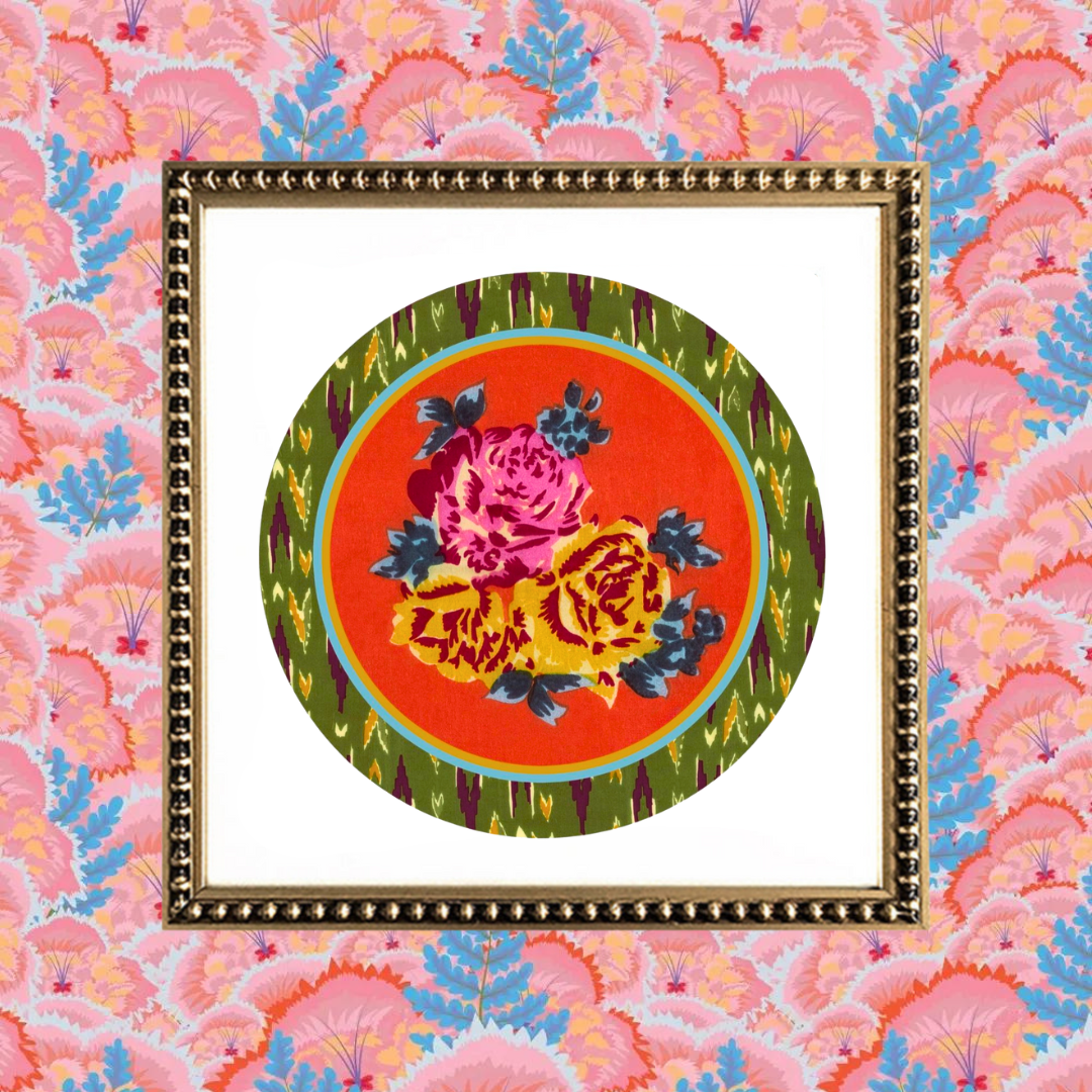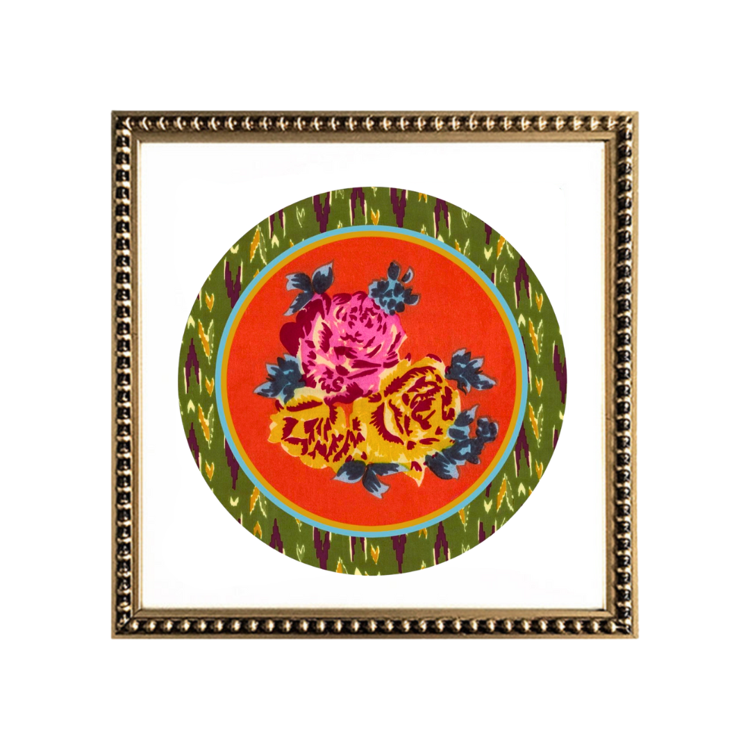 Cuadro de diseño de flores circular con fondo blanco y marco de madera perlas color dorado.