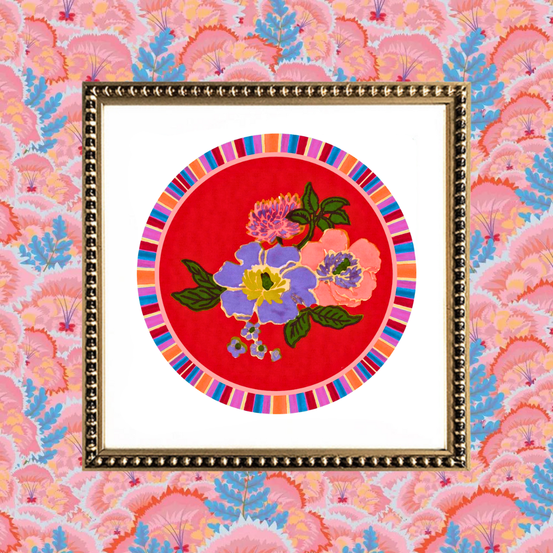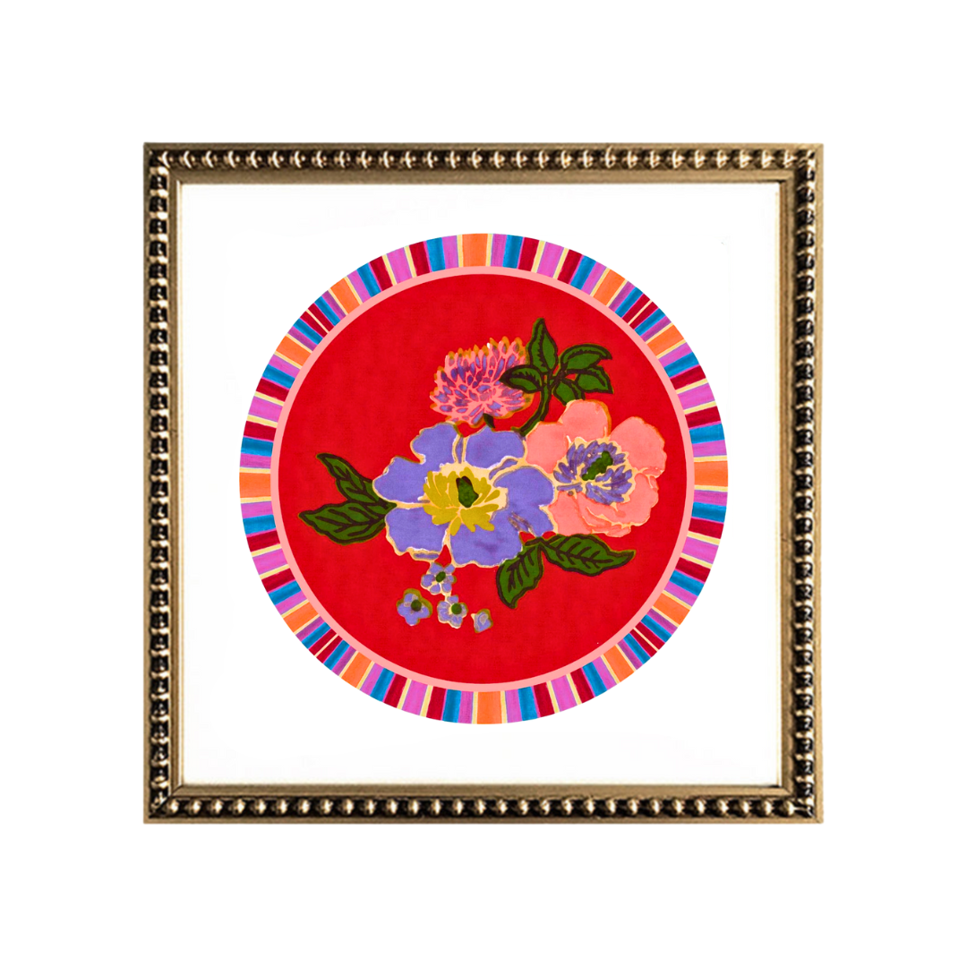 Cuadro de diseño de flores circular con fondo blanco y marco de madera perlas color dorado.